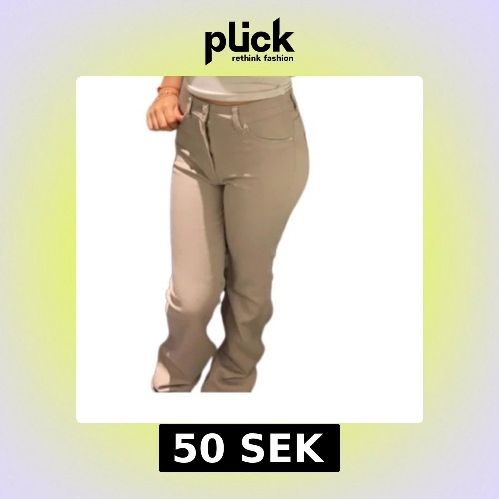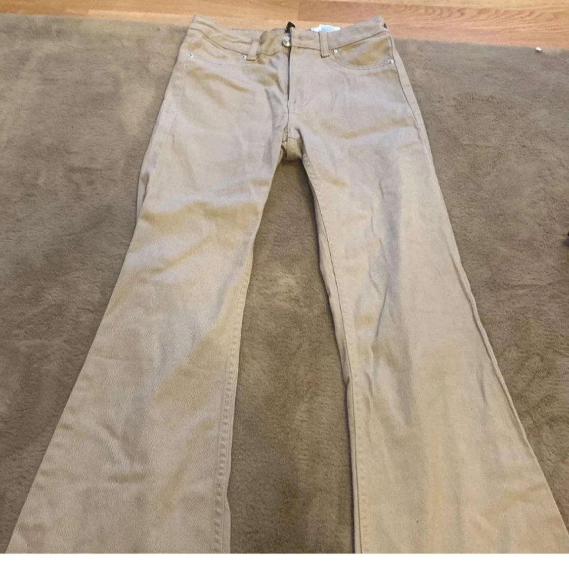 Snygga beige byxor med bootcut-stil och låg midja. Perfekta för en avslappnad look. Byxorna har klassiska fickor och stängs med dragkedja och knapp. Aldrig använd