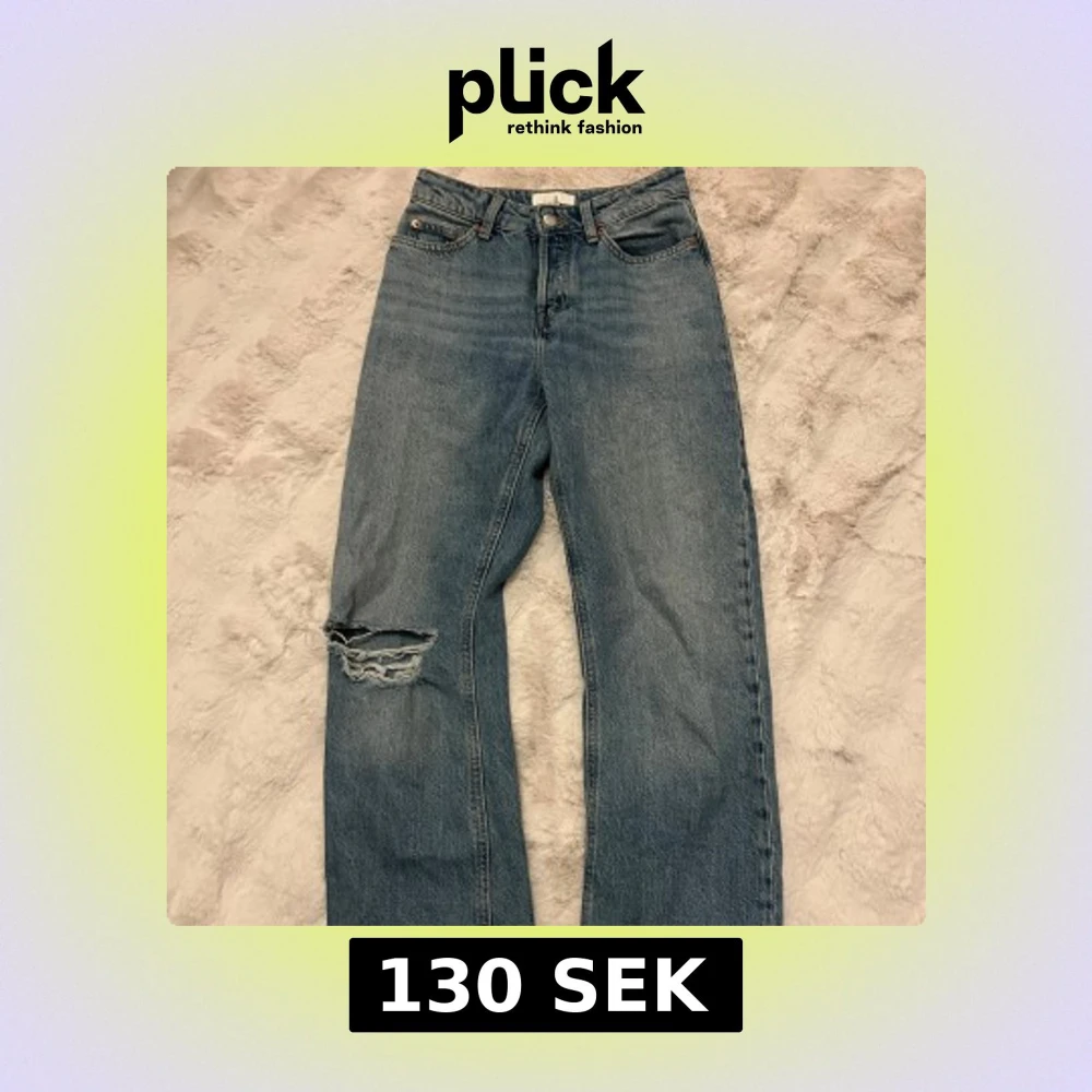 Säljer ett par klassiska blå jeans med rak passform och medel hög midja. Jeansen har en snygg slitning på ena knät. Perfekt för dig som gillar en avslappnad och trendig look.