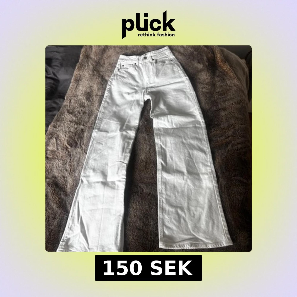 Säljer ett par vita jeans från H&M i storlek 34. Byxorna har hög midja, raka ben med wide fit. Inga fläckar och i väldigt fint skick.