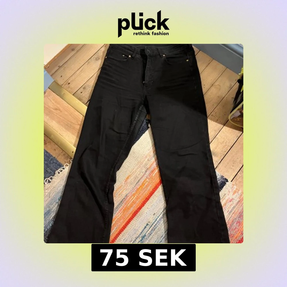 Snygga svarta jeans med klassisk femficksdesign och lite vida ben. Jeansen har hög midja. Passar perfekt till sneakers eller boots och har en stilren look. Från H&M. Använda många gånger.