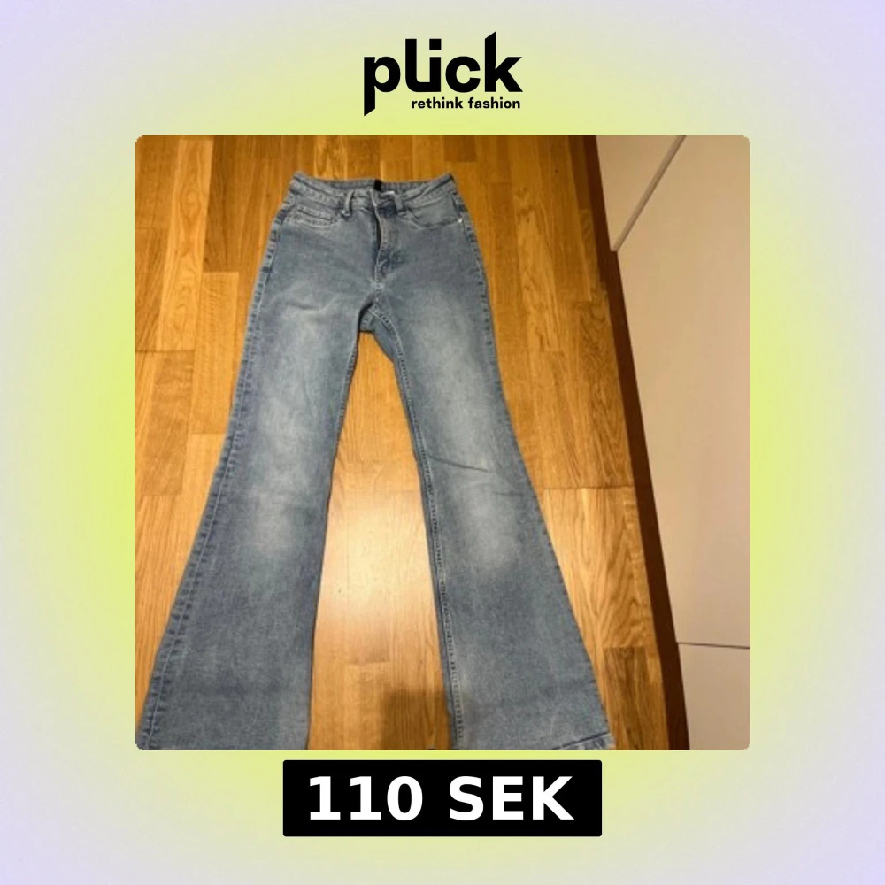 Snygga blå bootcut jeans med klassisk femficksdesign. De har en lätt tvättad look och är perfekta för en avslappnad stil. Passar bra till både sneakers och klackar.