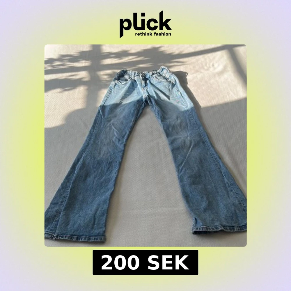 Säljer ett par blå bootcut jeans med låg midja och broderade detaljer på bakfickorna. Jeansen har knappar framtill och en klassisk femficksdesign. Perfekta för dig som gillar en retro vibe och vill ha något unikt i garderoben.