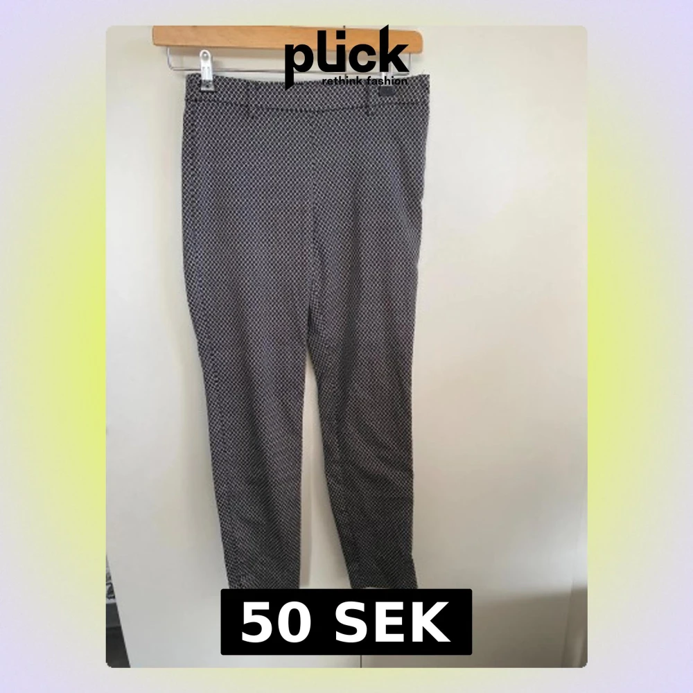Snygga svarta kostymbyxor med vitt geometriskt mönster. Byxorna har rak passform, bälteshällor och diskreta bakfickor. Materialet känns mjukt och har en lätt stretch. Dragkedja i sidan för smidig påklädning. Perfekta för dig som gillar stilrena detaljer.