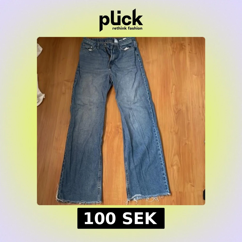 Säljer ett par blå jeans med fransiga kanter. De har en klassisk femficksdesign och en bekväm passform. Perfekta för en avslappnad stil.