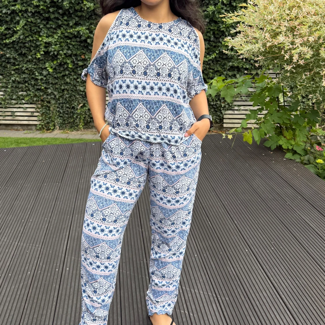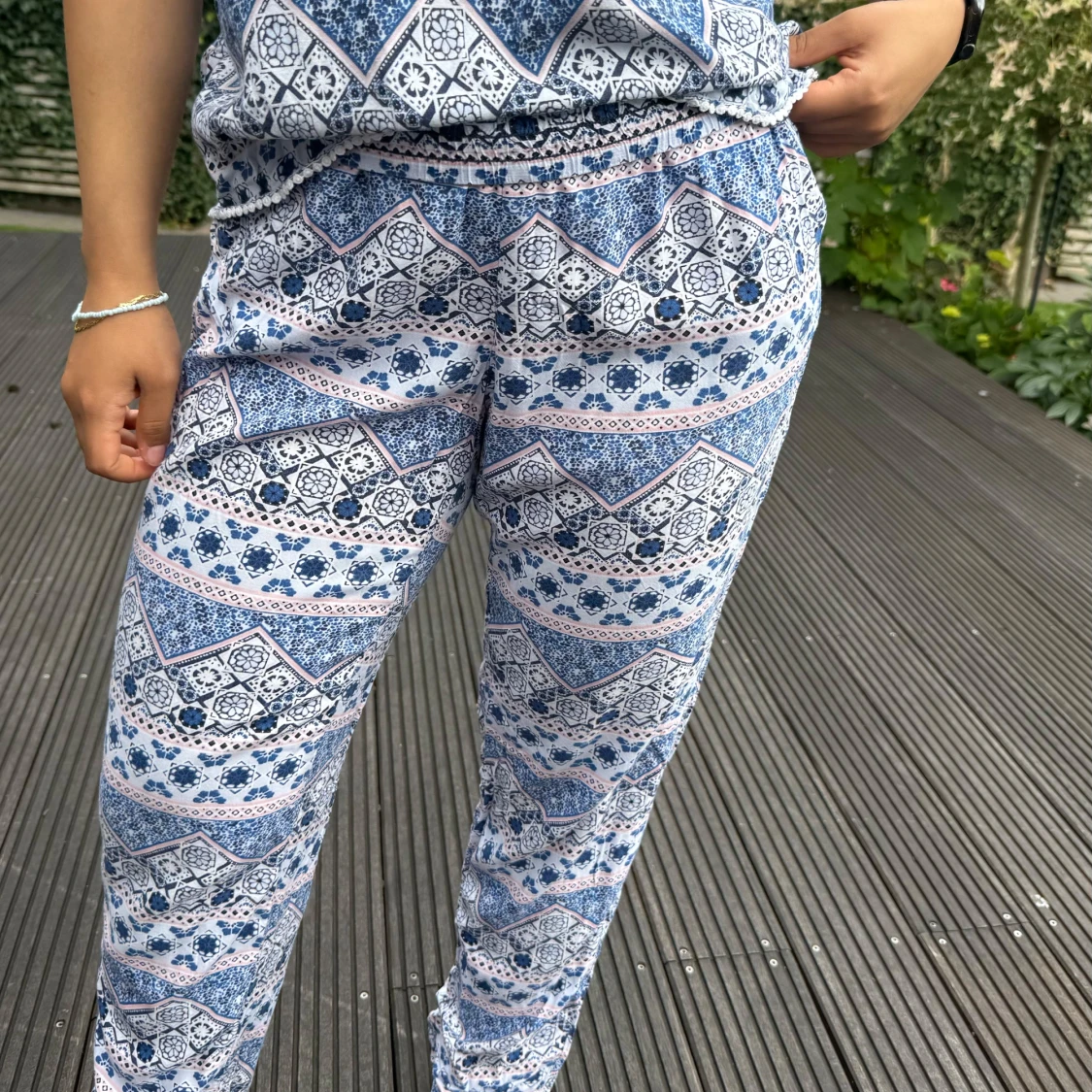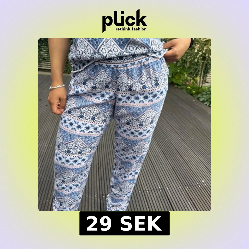 Säljer ett par lätta och luftiga linnebyxor med blått och vitt mönster. Byxorna har raka ben, elastisk midja och ett avslappnat snitt. Perfekta för varma dagar när du vill ha något bekvämt men ändå snyggt.