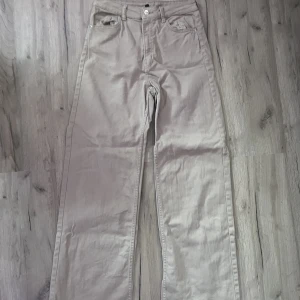 Vita kostymbyxor med bootcut - Snygga vita kostymbyxor med bootcut-snitt och låg midja. Byxorna har klassiska fickor fram och stängs med dragkedja och knapp. Materialet känns som bomull eller polyester och de har en clean, fräsch look som är lätt att matcha med olika toppar. Lite noppiga på vissa ställen.