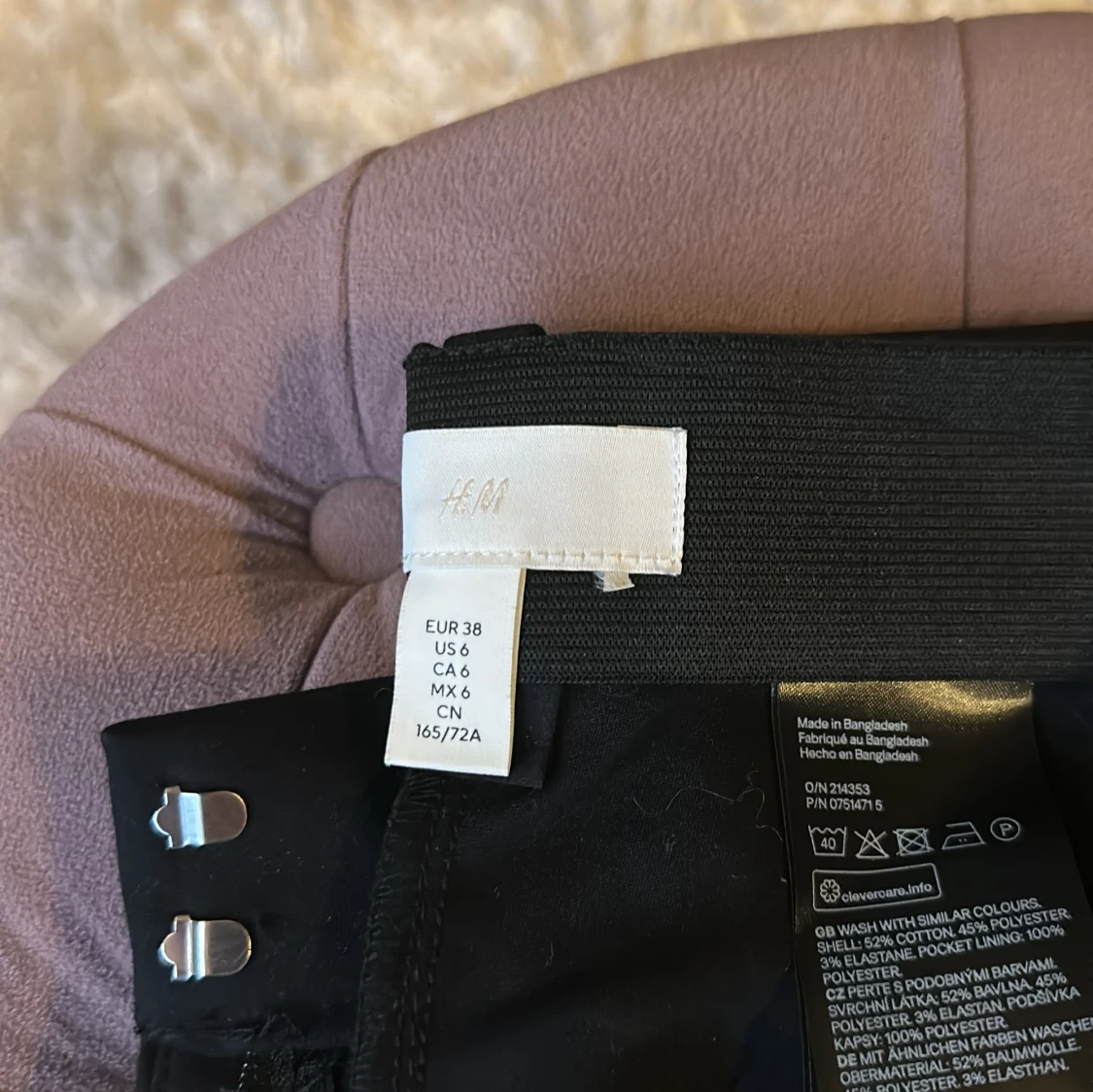 Klassiska svarta kostymbyxor från H&M i storlek 38. Byxorna har hällor för bälte, två bakfickor och stängs med hyska och hake. Materialet är en mix av polyester, viskos och elastan för en bekväm passform.