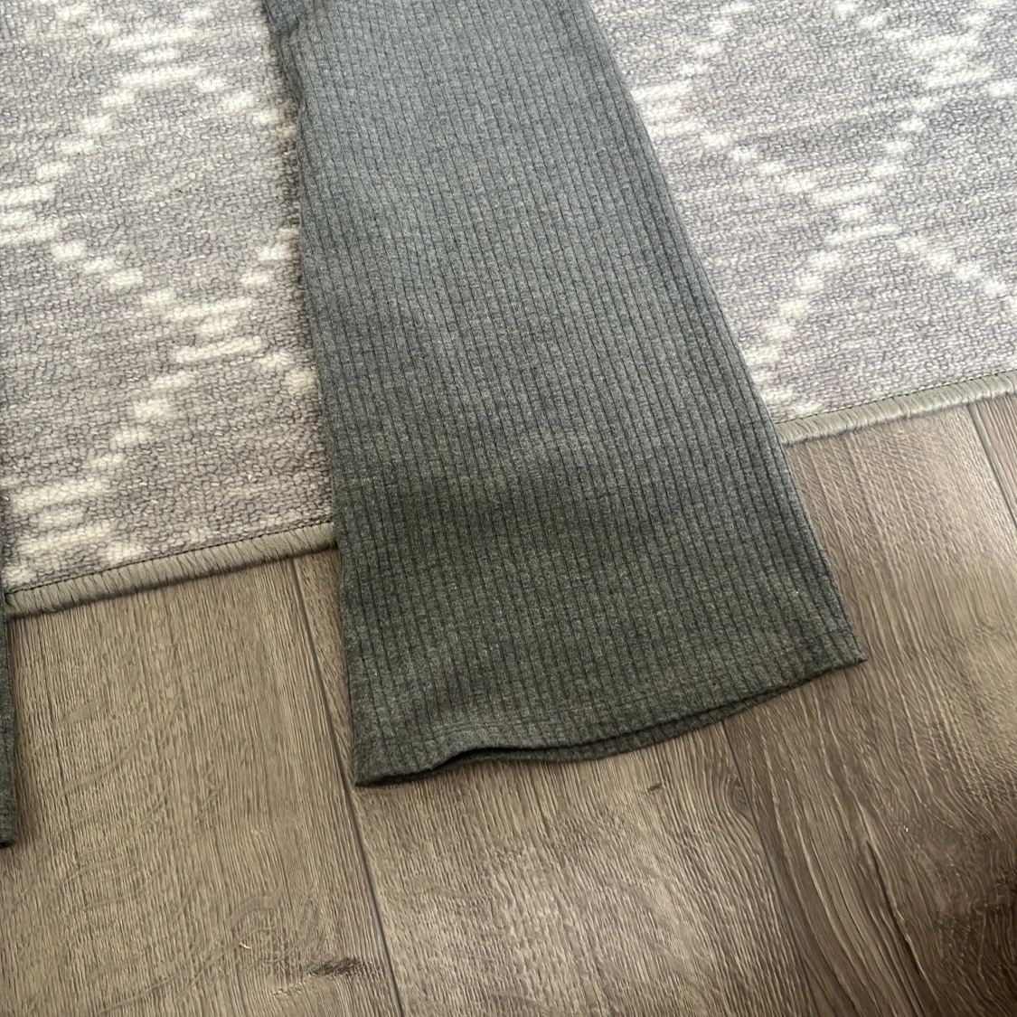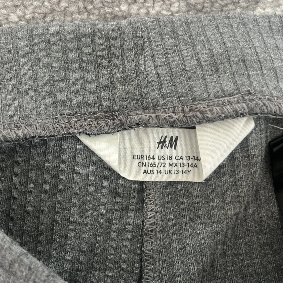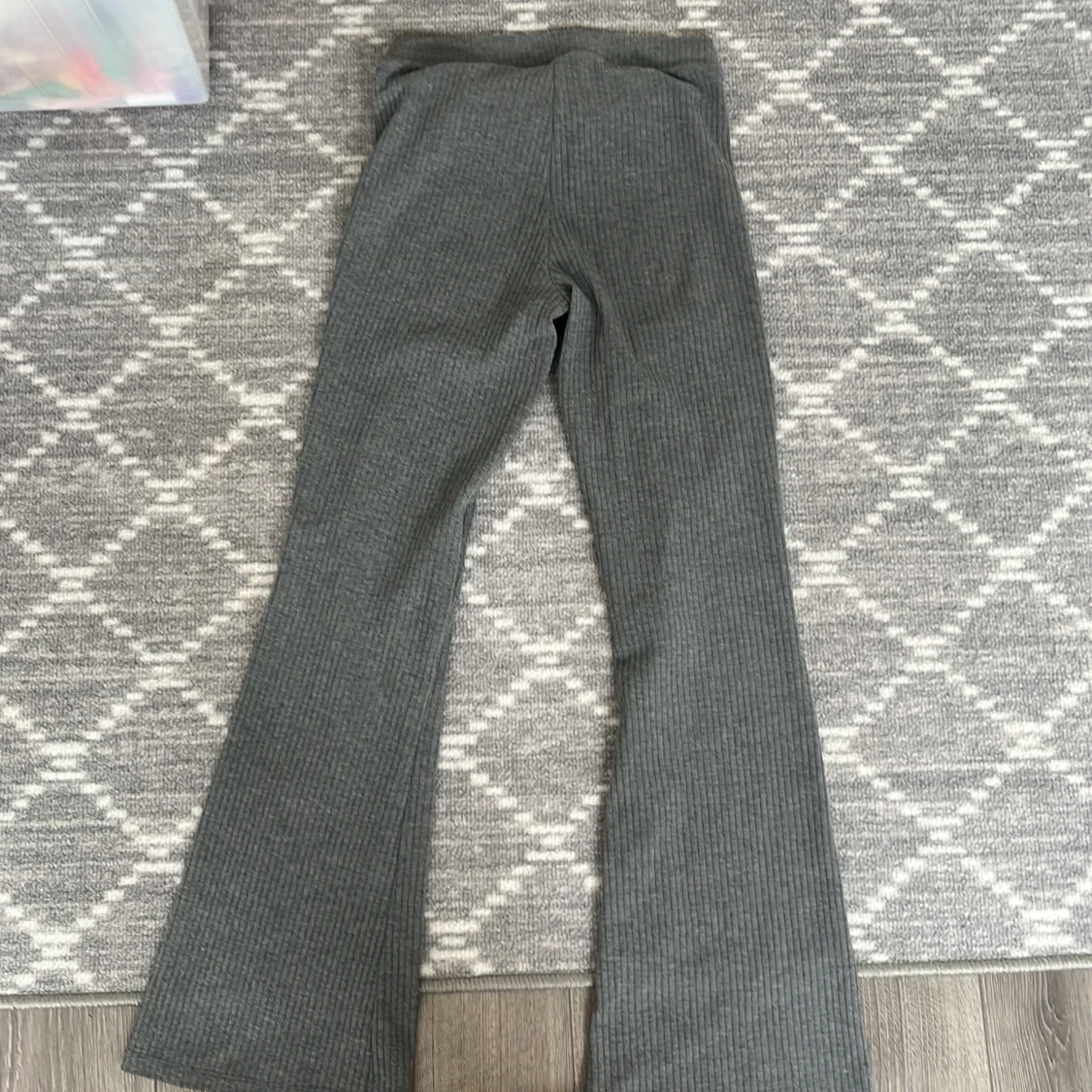 Säljer ett par grå ribbade bootcut-byxor från H&M. Byxorna har en mjuk och stretchig känsla med utsvängda ben och hög midja. Perfekta för en avslappnad och trendig look.