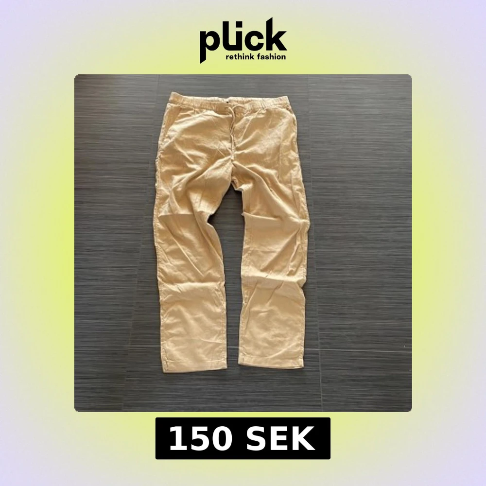 Säljer ett par bekväma beige linnebyxor från H&M med elastisk midja och snörning. Perfekta för en avslappnad stil. Byxorna har en rak passform och är tillverkade i ett lätt och luftigt material.