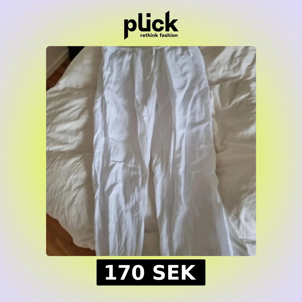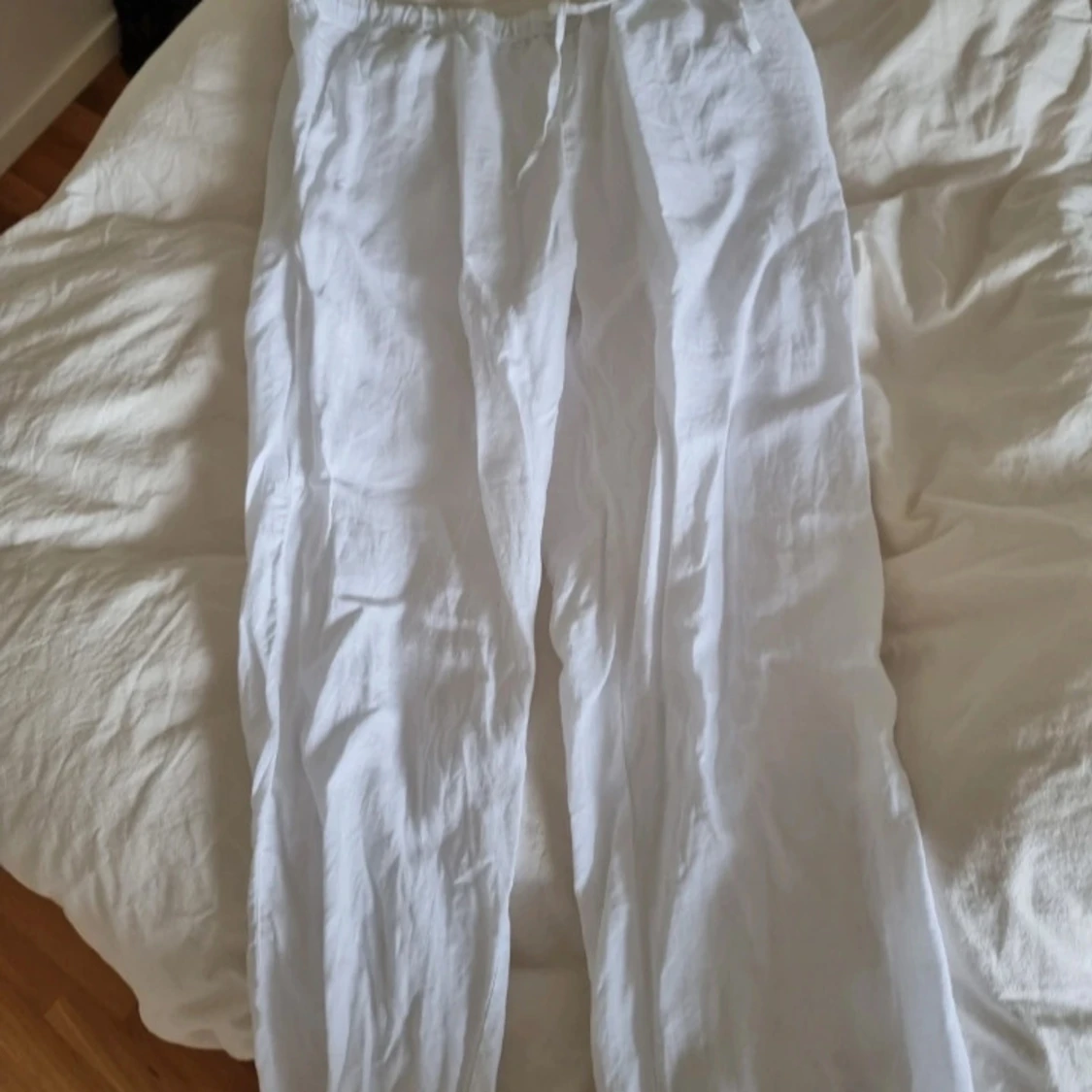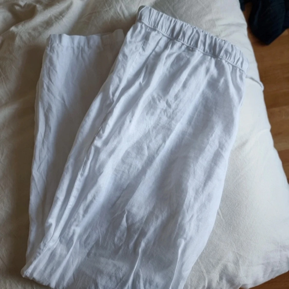 Säljer ett par fräscha vita linnebyxor med avslappnad passform och resår i midjan. Perfekta för varma dagar och riktigt sköna att bära. Luftiga och stilrena, passar till allt från sneakers till sandaler.