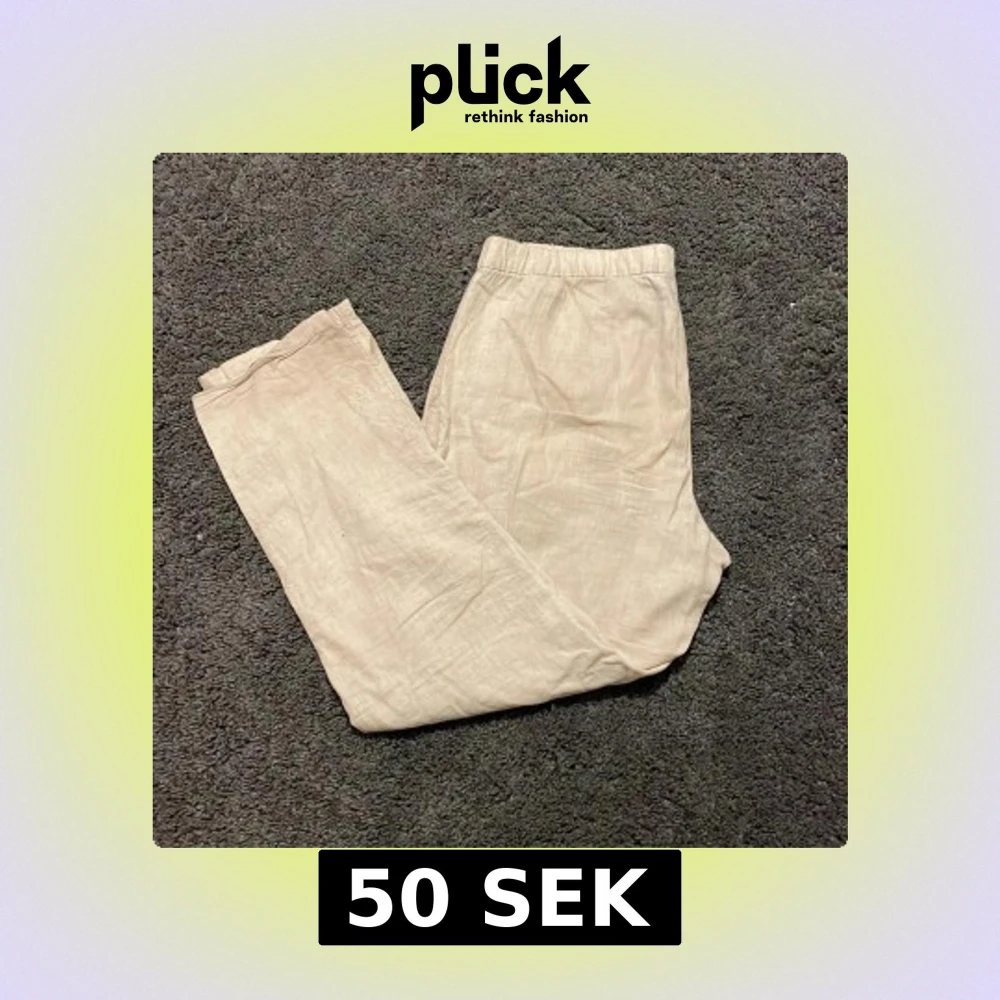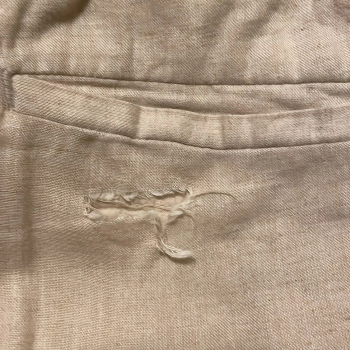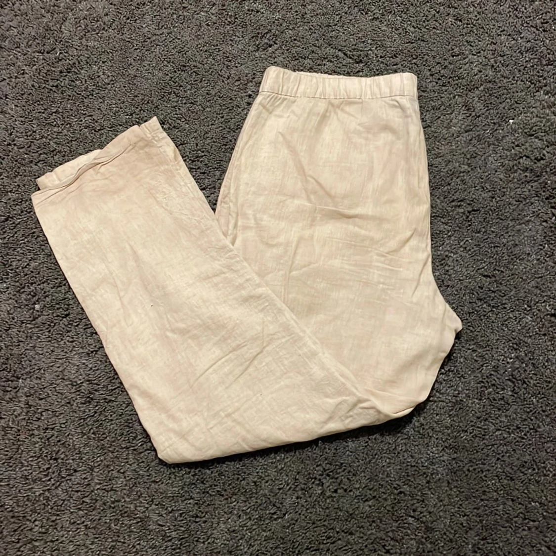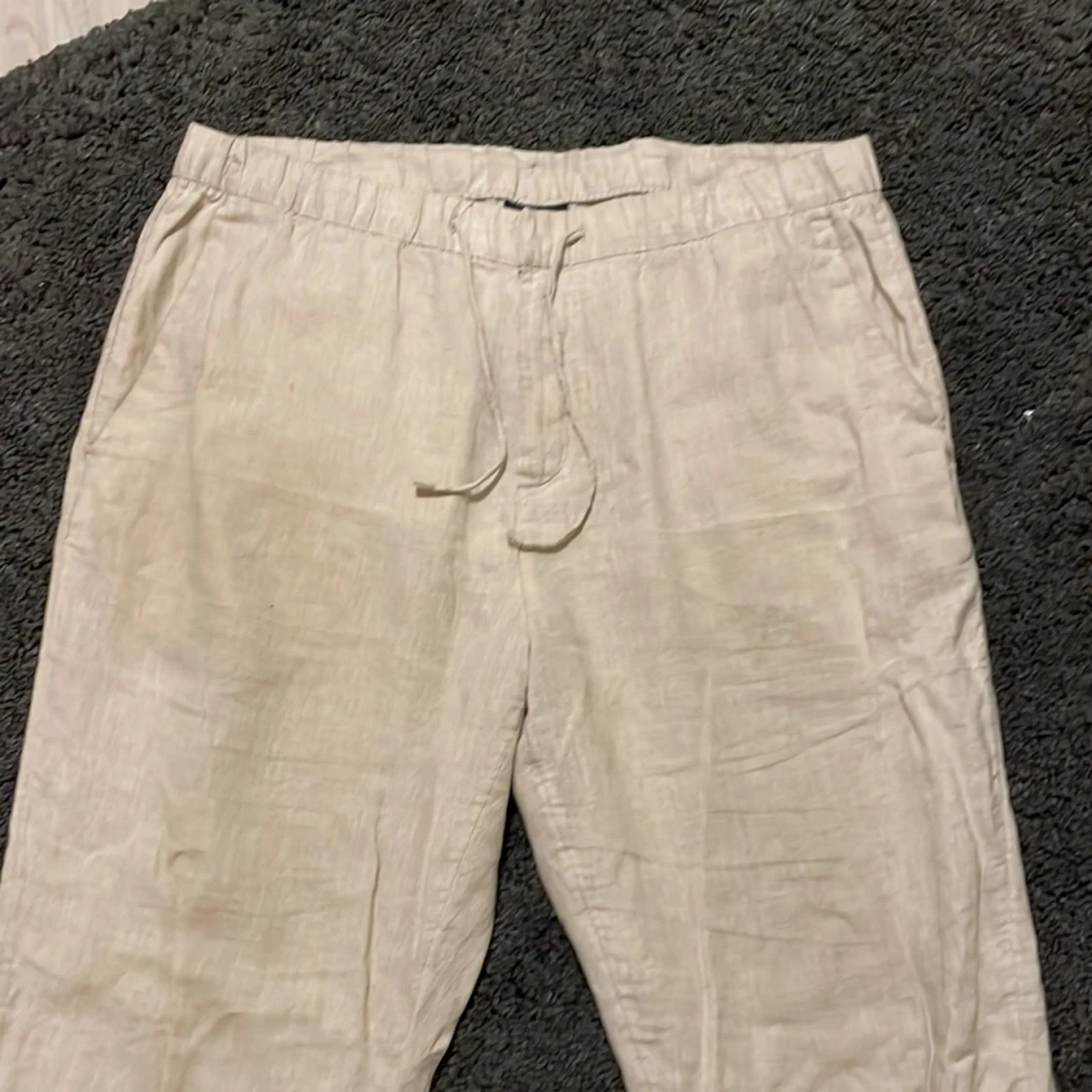 Säljer ett par beige linnebyxor från H&M, byxorna har ett hål på ungefär 1-2 cm på högra bakfickan, hålet är en enkel lagning