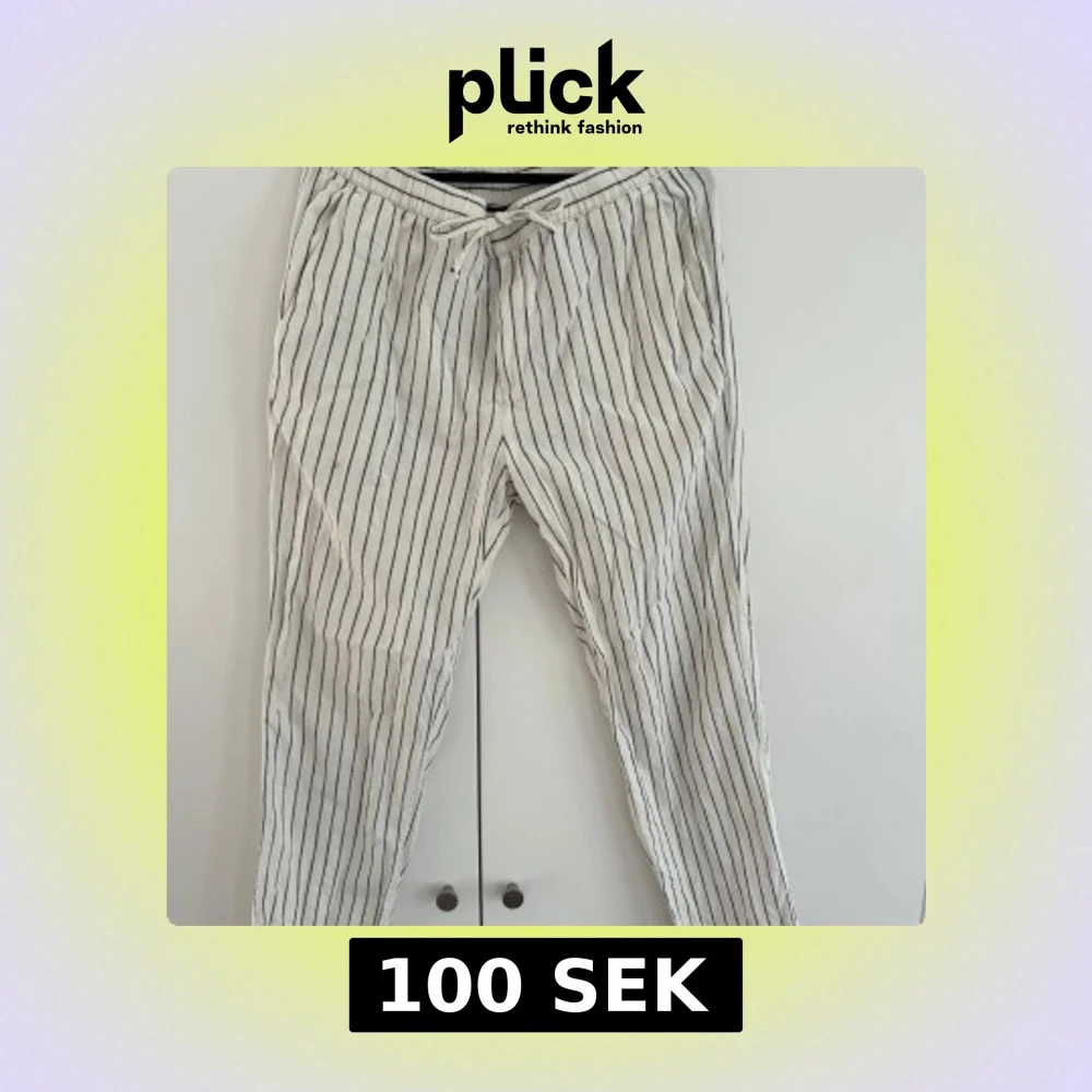 Snygga vita linnebyxor från H&M med svarta vertikala ränder och dragsko i midjan. Regular fit med elastisk midja och fickor både fram och bak. Perfekta för en chill och stilren look under varmare dagar.