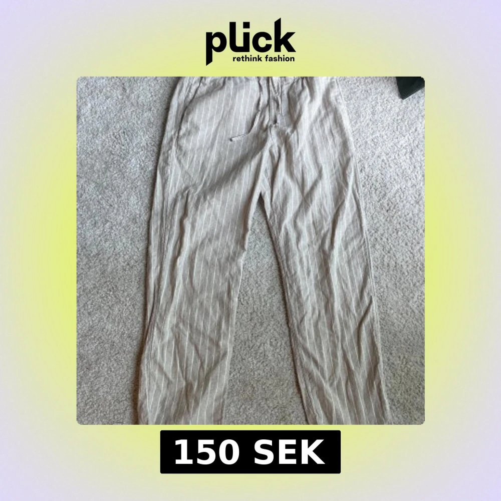 Snygga beige linnebyxor med vita ränder och avslappnad passform. Byxorna har elastisk midja med snörning och raka ben, perfekta för en chill och stilren look. Lätta och luftiga, passar grymt till sommaren. Linnebyxorns är från HM i storlek S kontakta vid minsta fundering