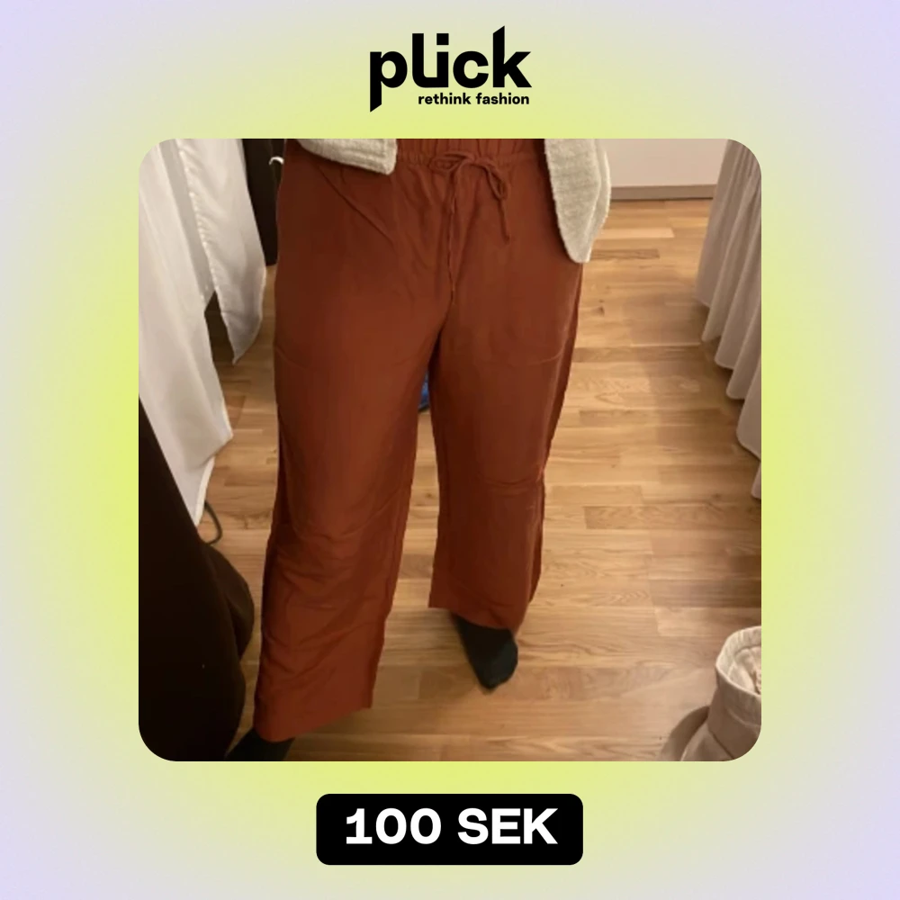 Säljer dessa byxorna (linne blend)från hm, färgen är roströd 🫶