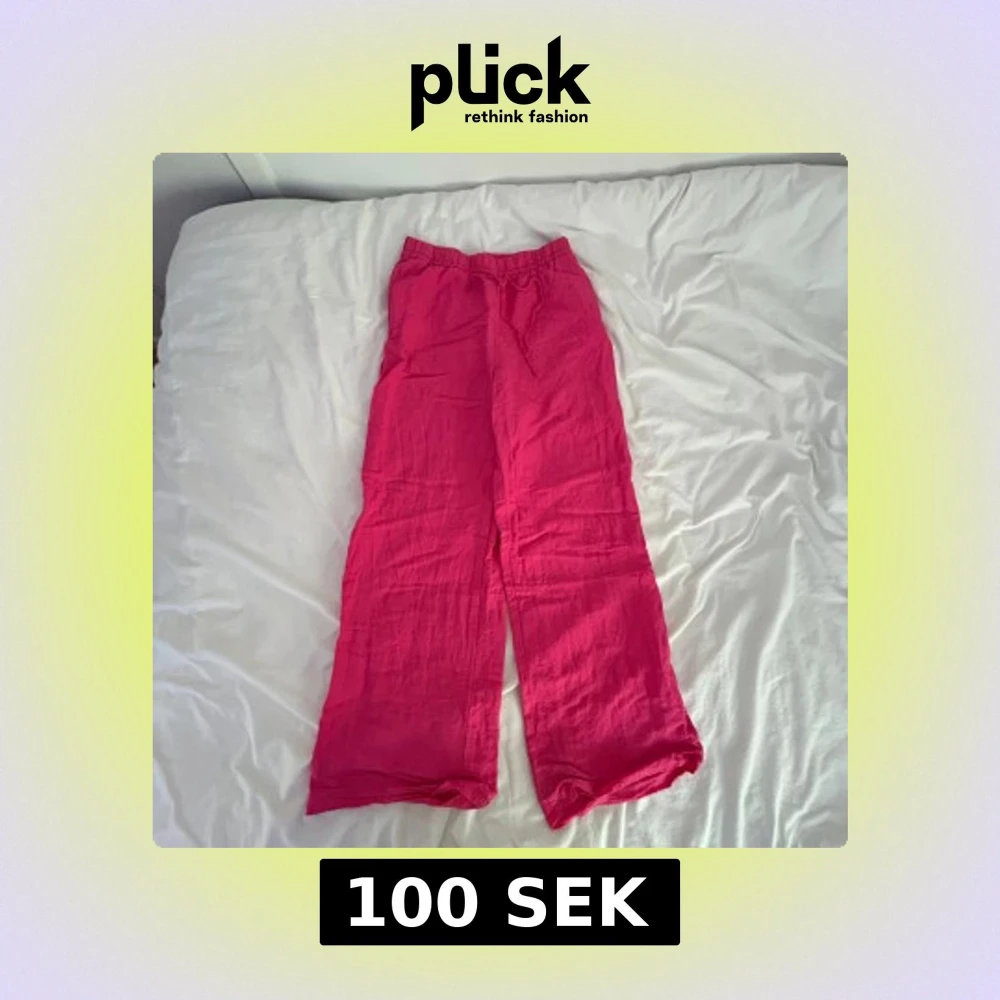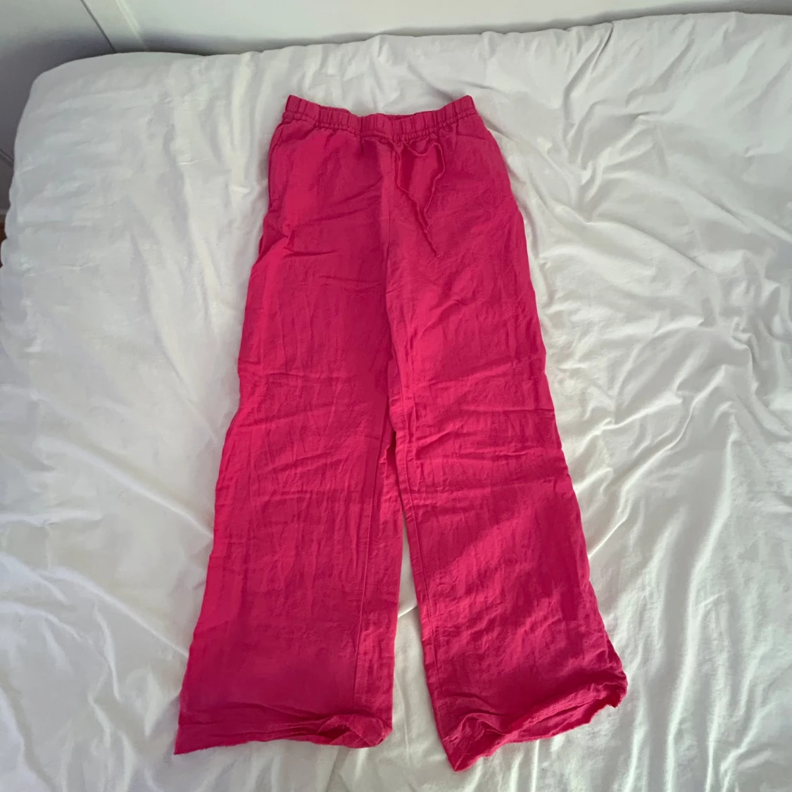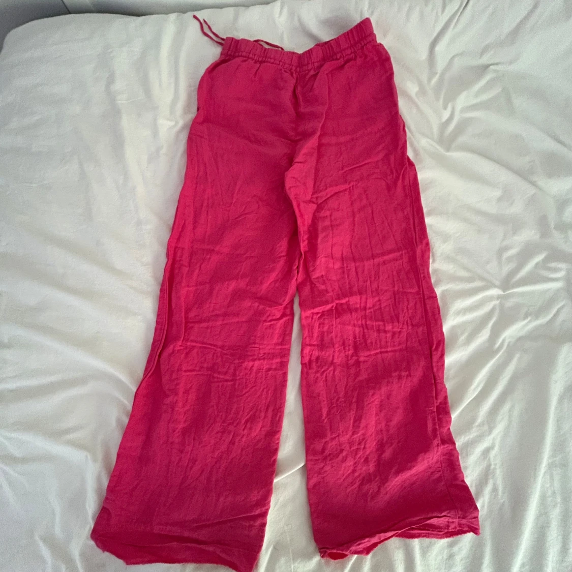 Snygga och chill rosa linnebyxor med breda ben och elastisk midja med snörning. Perfekta för varma dagar när du vill ha något luftigt och bekvämt. Färgen är riktigt poppig och materialet är lätt och svalt.