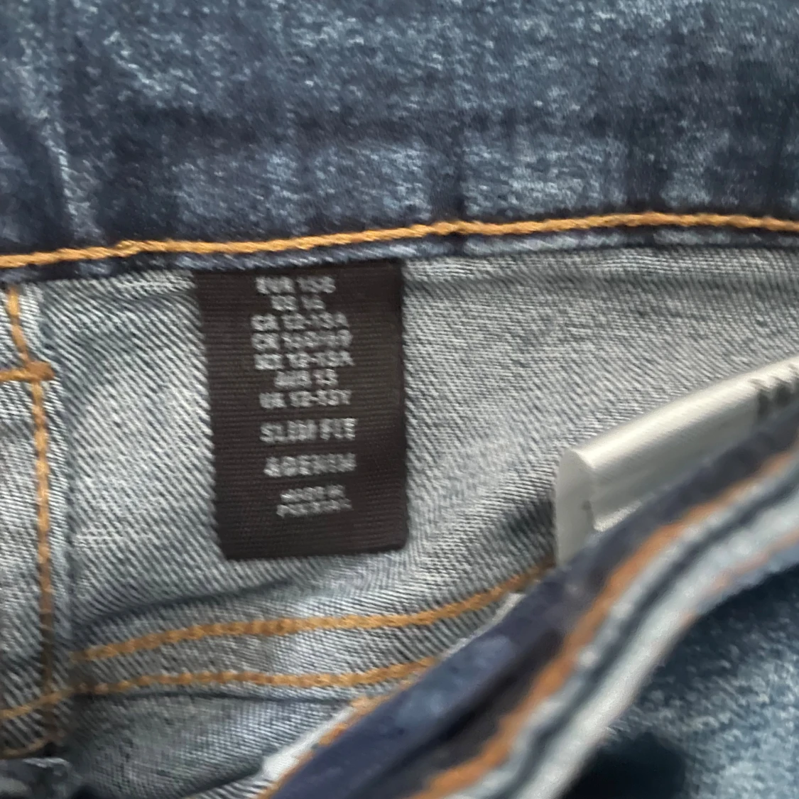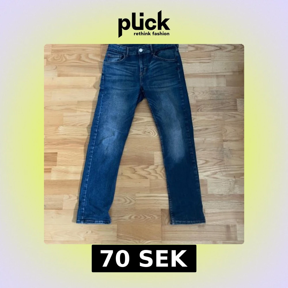H&M slim fit jeans i klassisk blå tvätt med lätt slitning på låren och knäna. Jeansen har fem fickor, normal midja och raka ben. Perfekta för dig som gillar en smalare passform och tidlös denimstil.