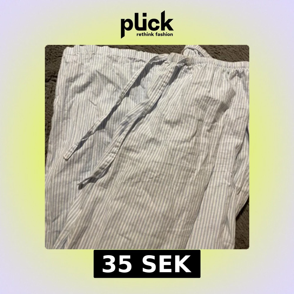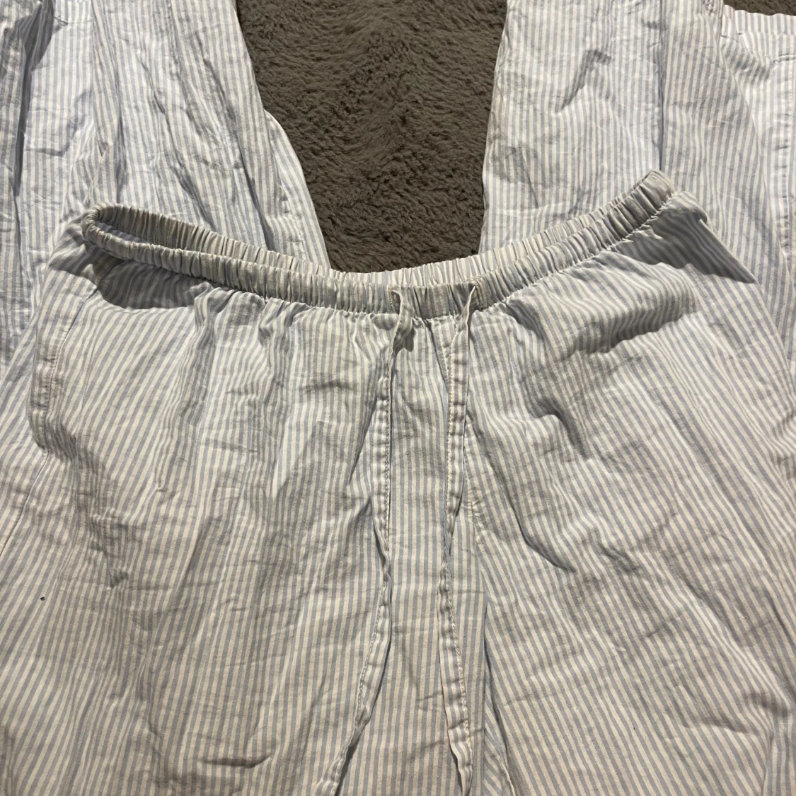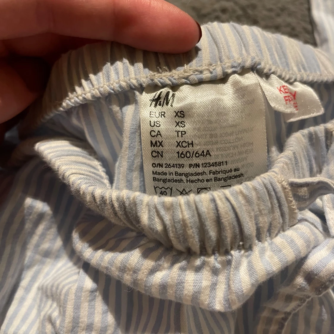 Luftiga linnebyxor från H&M i storlek XS. Byxorna har ljusblå och vita ränder, elastisk midja med snörning och är perfekta för varma dagar. Tillverkade i mjukt linne för en chill och bekväm vibe.
