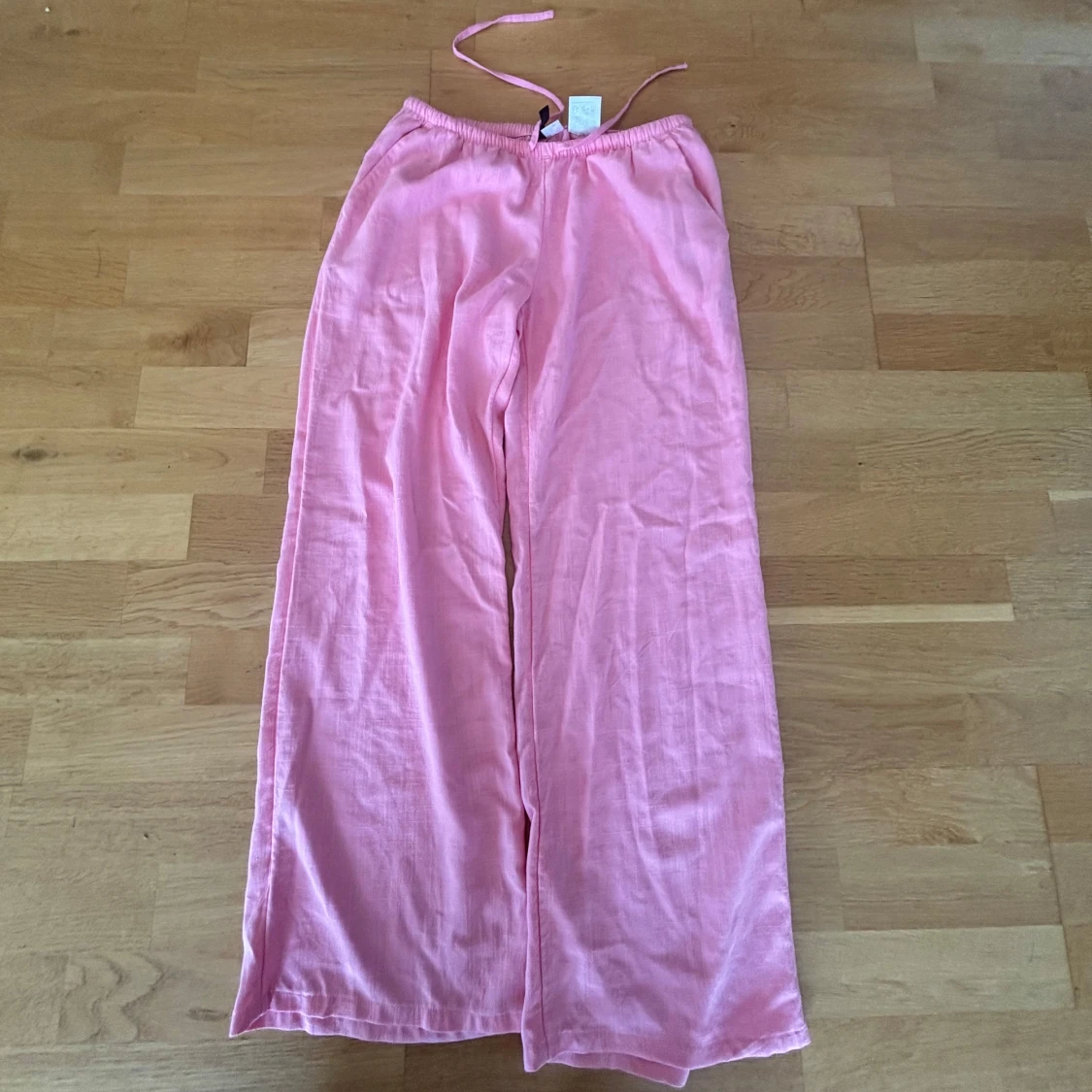 Säljer ett par lrosa linnebyxor med breda ben och avslappnad passform. Byxorna har elastisk midja med snörning och är tillverkade i ett svalt linnematerial. Perfekta för varma dagar när du vill ha något luftigt och bekvämt. Längden på linnebyxorna är kortade och är nu 90 cm från midjan.