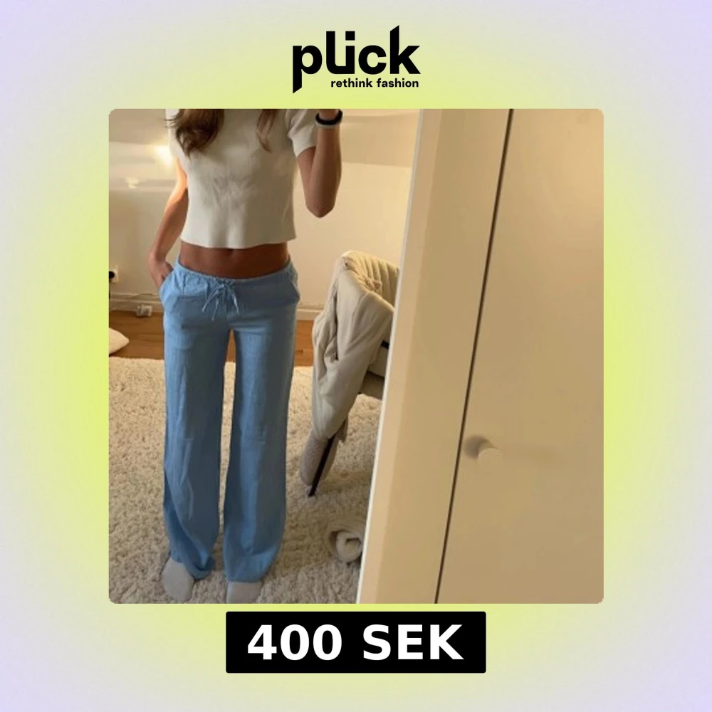 Jätte fina ljusblåa linnebyxor som inte längre säljs! Använda endast 2-3 gånger så i väldigt bra skick.💕 uppklippta längst ner för mig som är 160cm💗