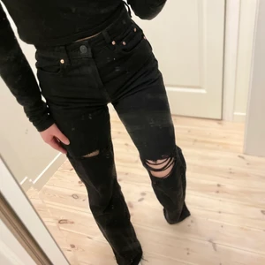 Raka twillbyxor från bershka som ej går att få tag på längre. Påminner lite om ginas ”90’s jeans”. Byxorna är avklippta, ändå släpas dem nere på golvet för mig. Jag är 152 cm för lite klarhet. Aldrig använda, endast provade ett antal gånger! 😄