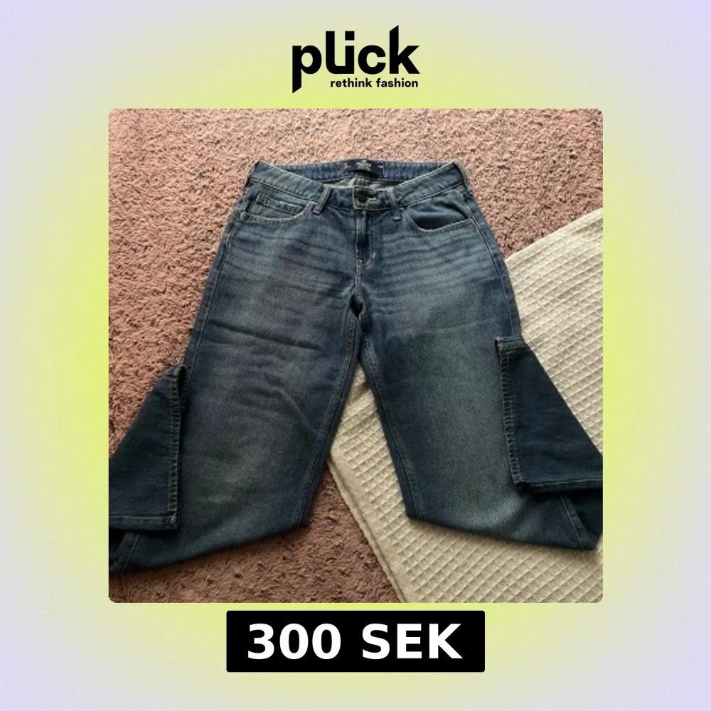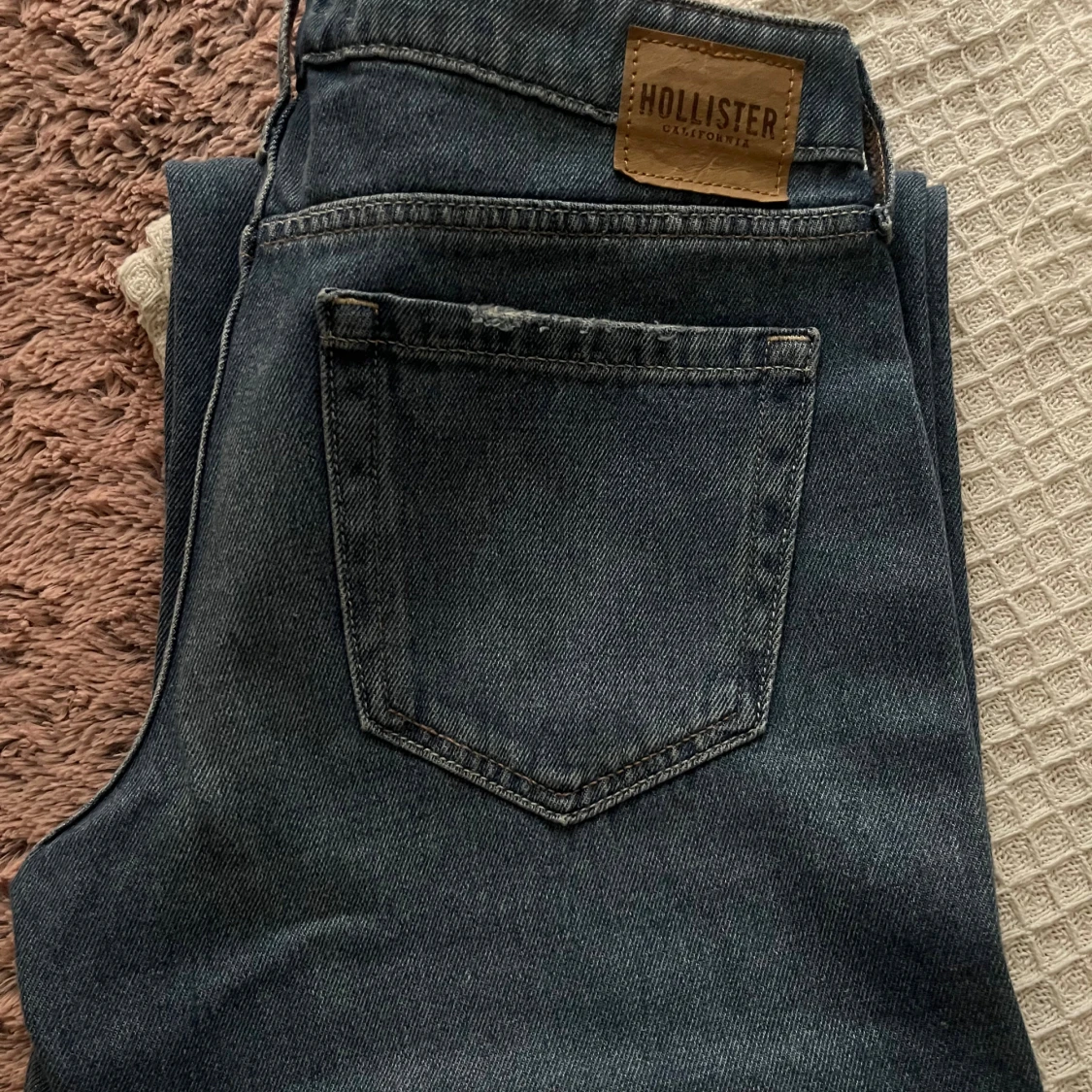 Snygga mörkblå jeans från Hollister med klassisk femficksdesign och brunt läderpatch bak. Jeansen har rak passform och subtila slitningar framtill för en cool look. Passformen är även baggy om man har storlek Xs-M.