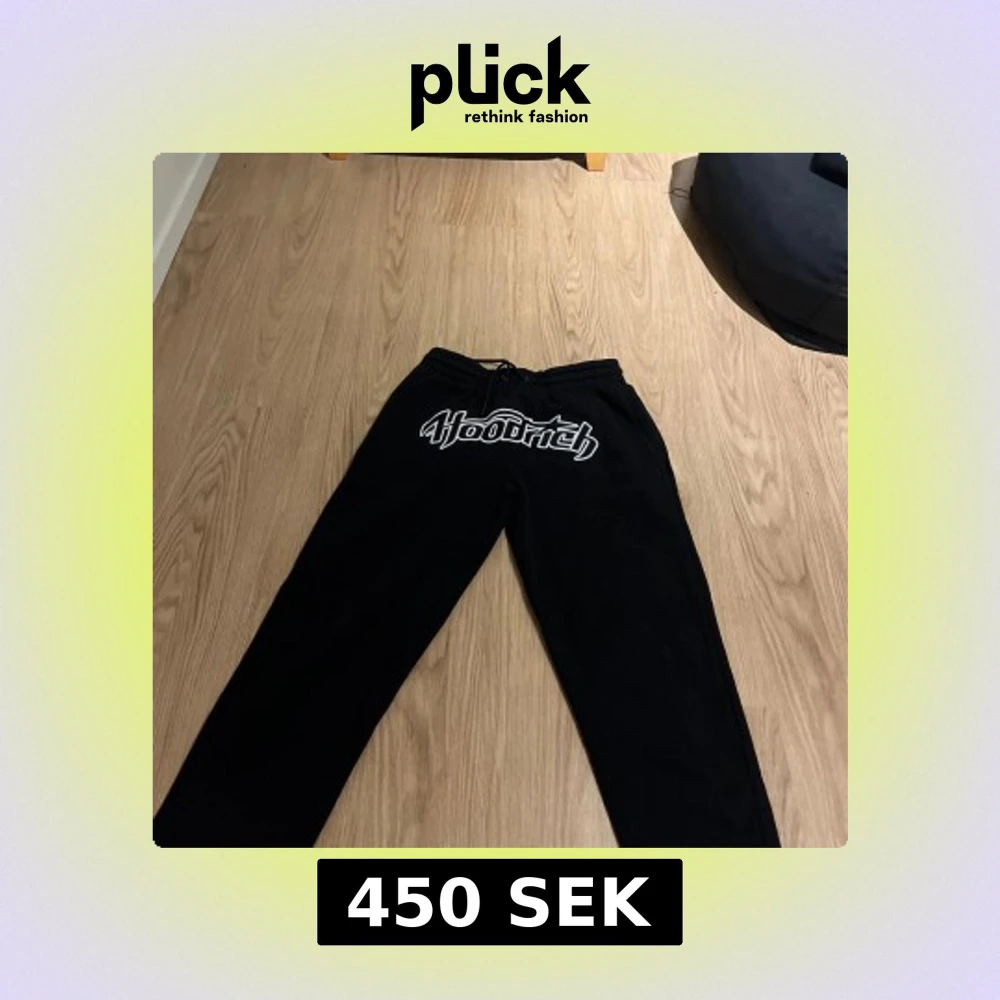 Svarta mjukisbyxor från Hoodrich med stort broderat Hoodrich-logo i vitt och svart framtill. Byxorna har elastisk midja med snörning och raka ben. Perfekt för chill eller streetwear-stil.
