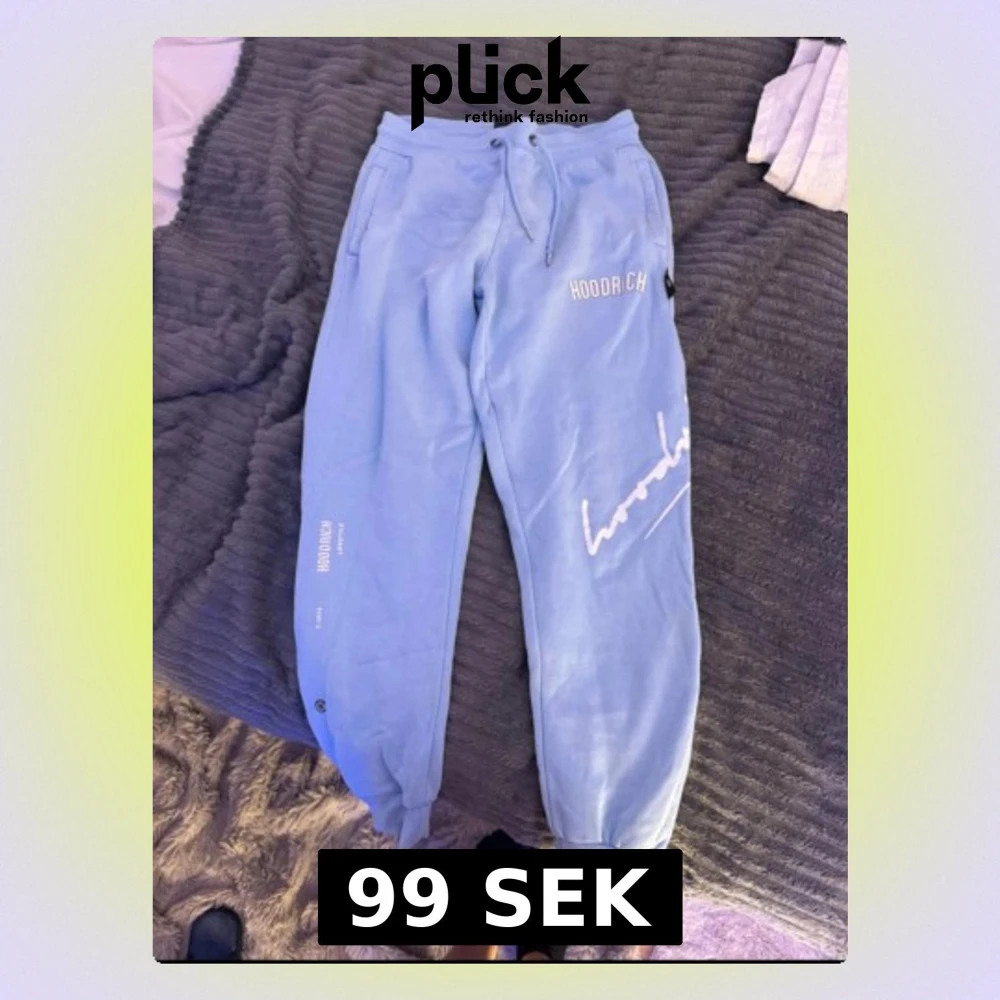 Snygga ljusblå mjukisbyxor från Hoodrich med vita tryckdetaljer och logga på benet. Byxorna har snörning i midjan, muddar vid bensluten och sidofickor. Perfekta för en chill och avslappnad stil. Den har en pytteliten fläck, men det märks inte alls av