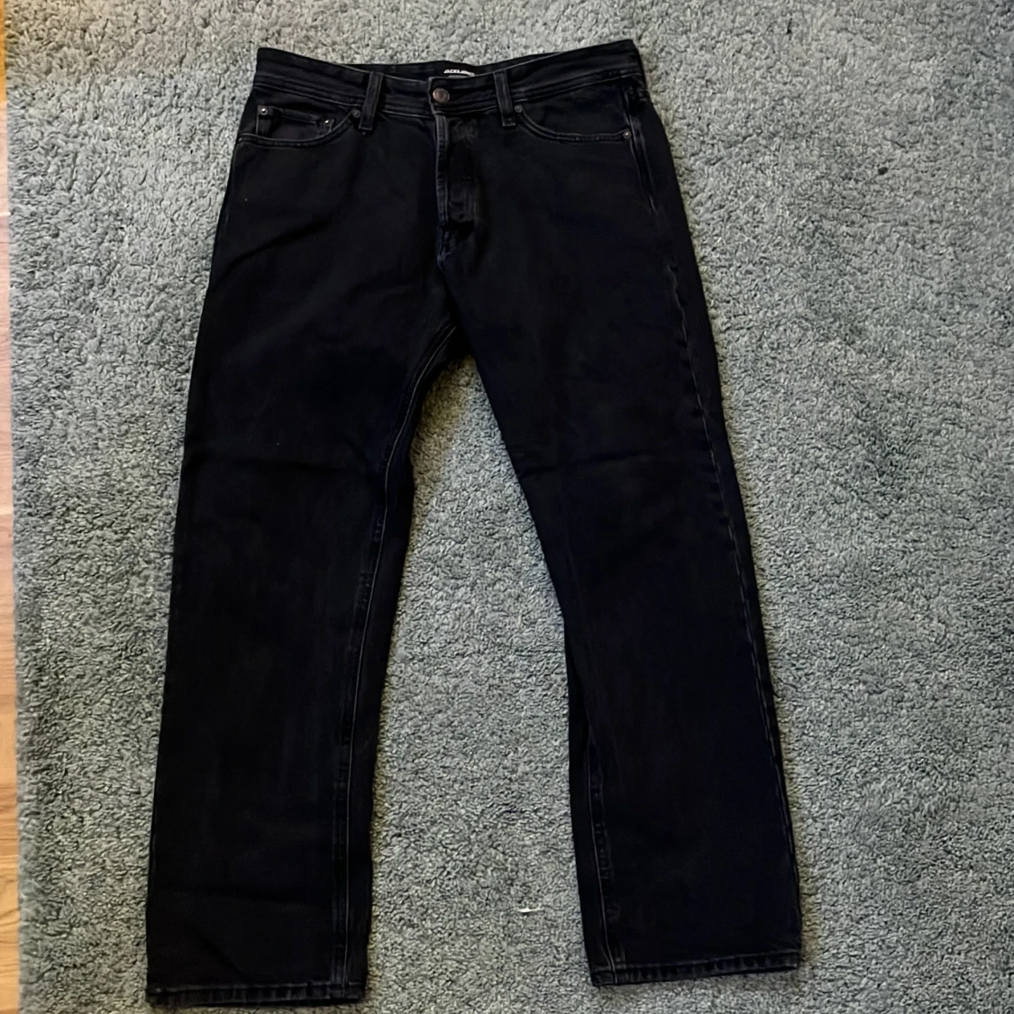 Snygga svarta jeansbyxor i modellen Relaxed/Chris. De har en avslappnad passform och klassisk design med fem fickor och knappgylf. Perfekta för en stilren look.