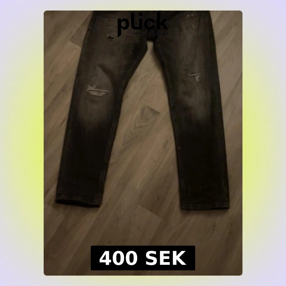 Säljer ett par svarta jeans från Jack & Jones med slitna detaljer och raka ben. Jeansen har klassisk femficksdesign och är tillverkade i ett stretchigt jeanstyg som ger en skön passform. Perfekta för dig som gillar en avslappnad och trendig look. Fåtal använd så det är ny