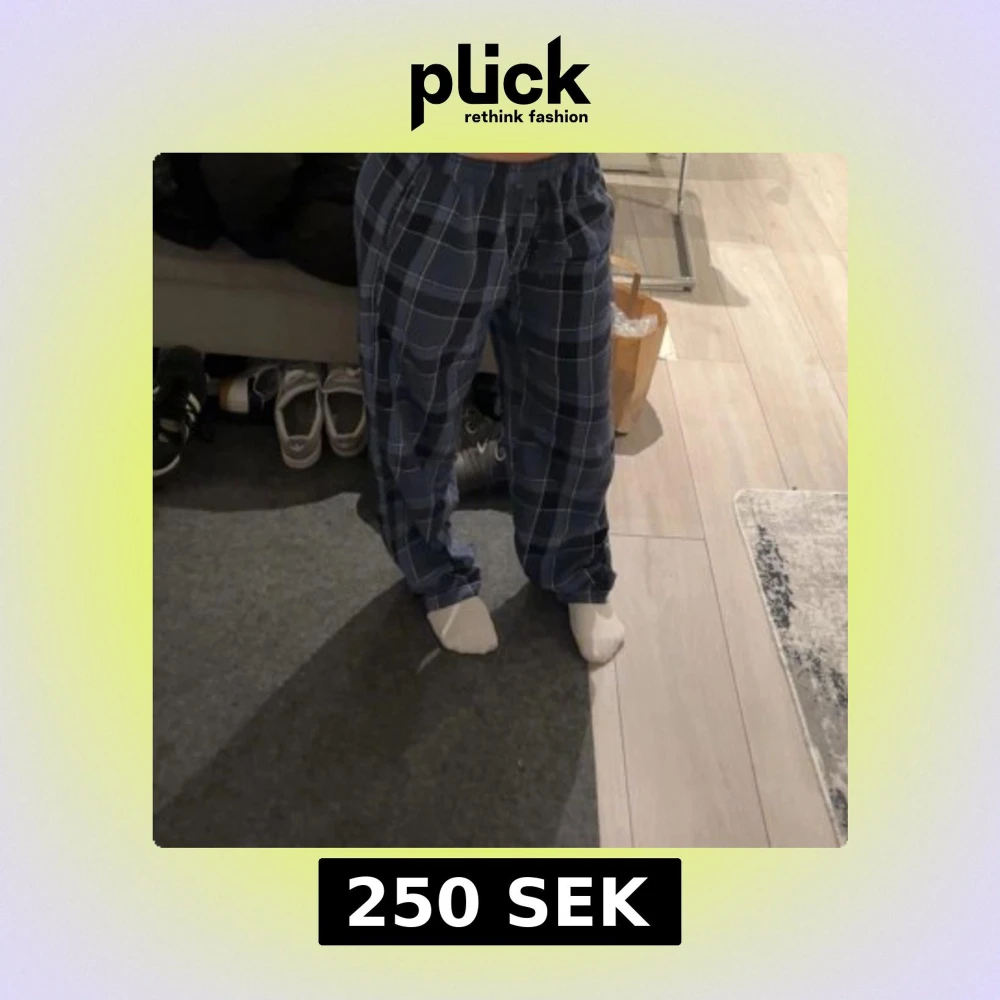 Säljer ett par bekväma blå rutiga byxor med elastisk midja. Byxorna har en loose passform och är perfekta för en avslappnad stil. De har ett klassiskt rutmönster i olika nyanser av blått.