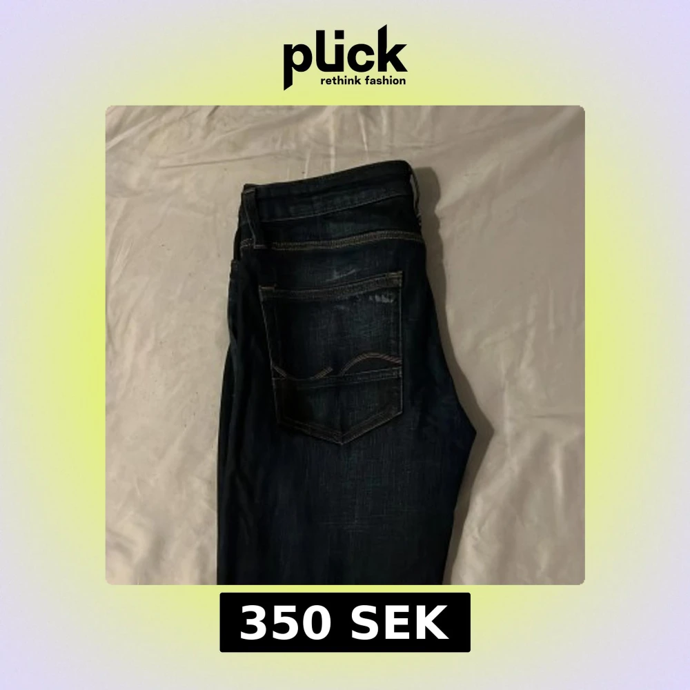 Riktigt snygga mörkblå jeans från Jack & Jones med klassisk femficksdesign. Jeansen har rak/slim passform. 30/32 men kan passa 34