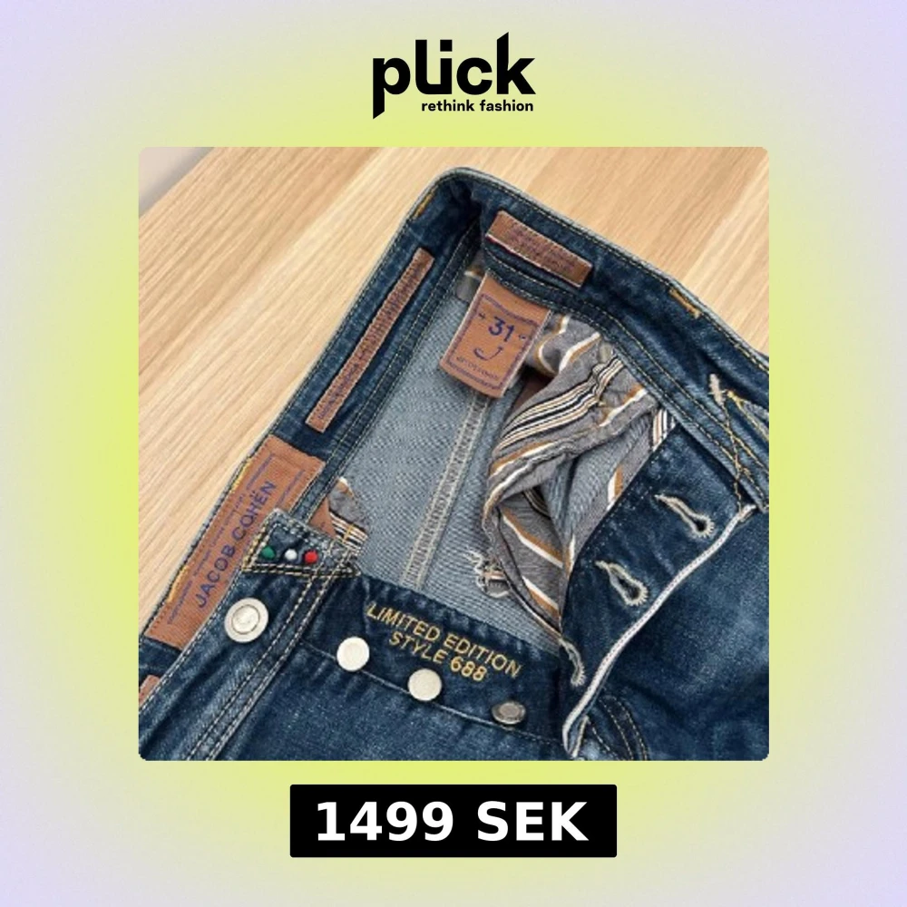 Snygga blå jeans från Jacob Cohen, Limited Edition Style 688. Klassisk femficksmodell med gul J-broderi på fickan och kontrastsömmar. Jeansen har rak passform och är tillverkade i mjukt denim med silverfärgade knappar och detaljer. Skriv om du har några frågor.billigare vid snabb och smidig affär