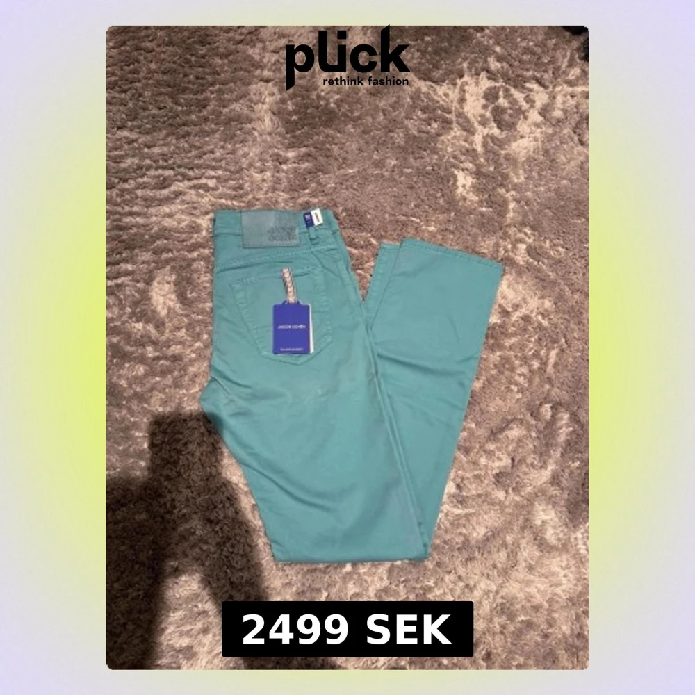 Snygga turkosa jeansbyxor från Jacob Cohën i modellen Bard. Byxorna har klassisk femficksdesign, knappgylf och detaljerad etikett bak. Materialet är mjukt och känns lyxigt, perfekt för dig som vill sticka ut med färg. Märkeslapp och originaltagg kvar.