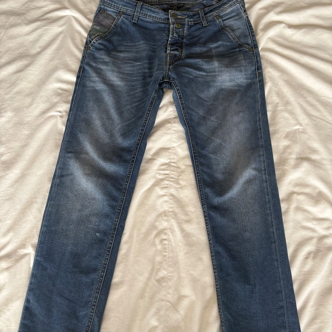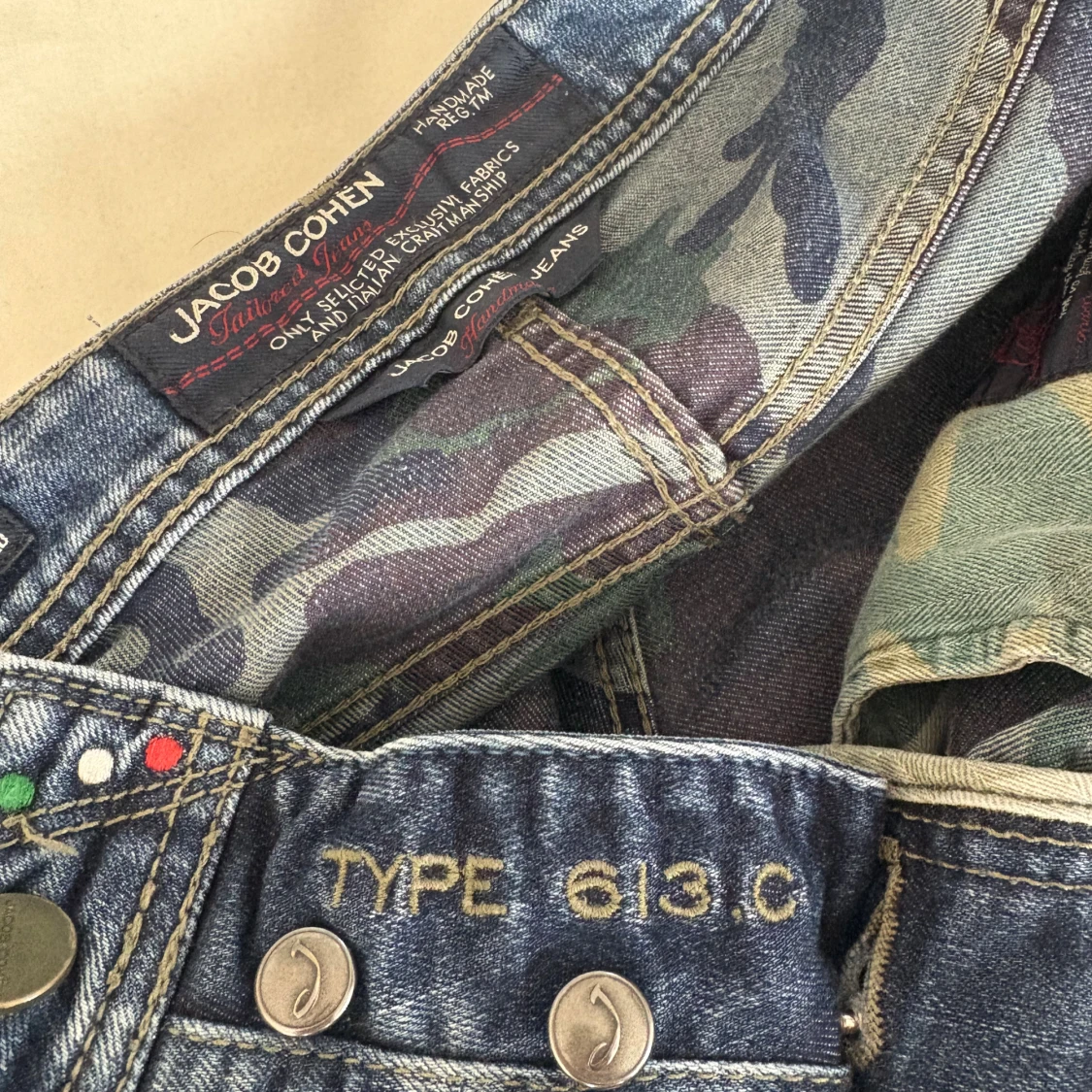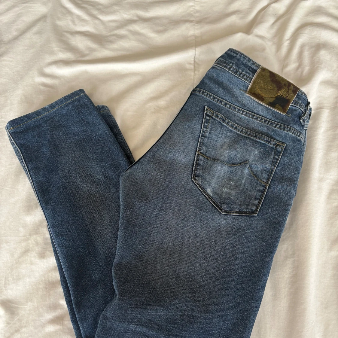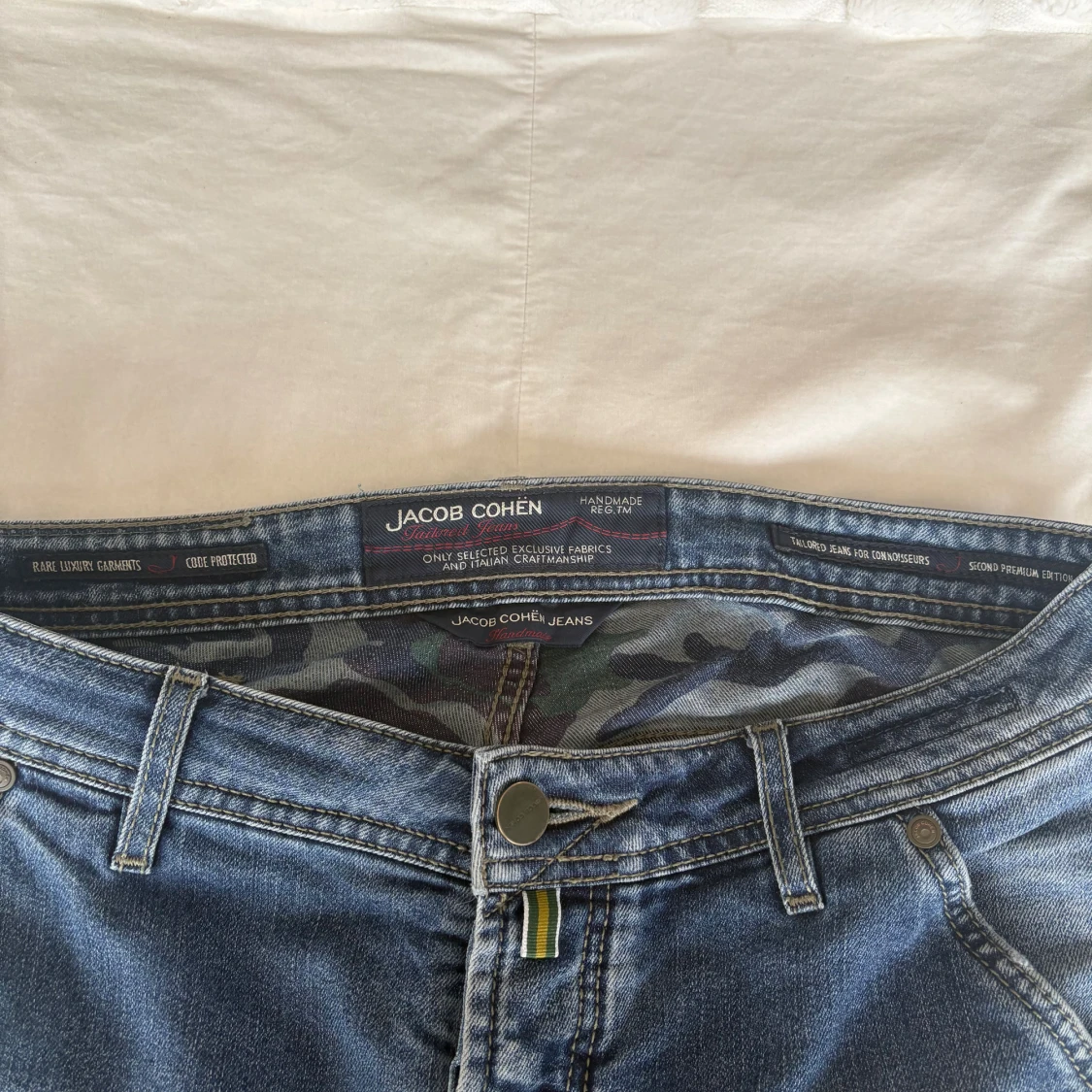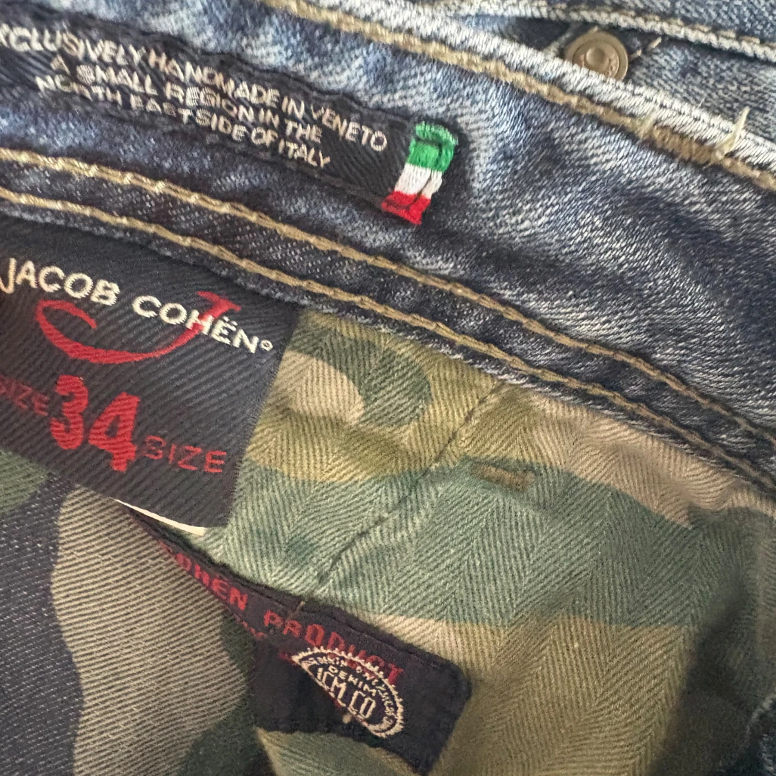Snygga blå jeans från Jacob Cohen i klassisk straight fit. Jeansen har coola camouflage-detaljer på insidan av midjan och bakre patchen. Tillverkade i mjukt bomullsmaterial med slitningar för en avslappnad look. Perfekt för dig som gillar exklusiva och unika jeans. Passar w32