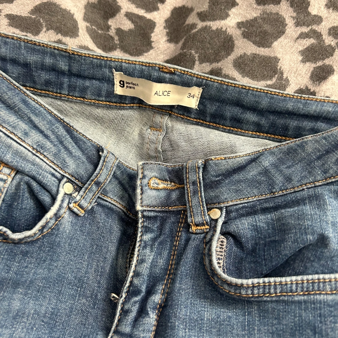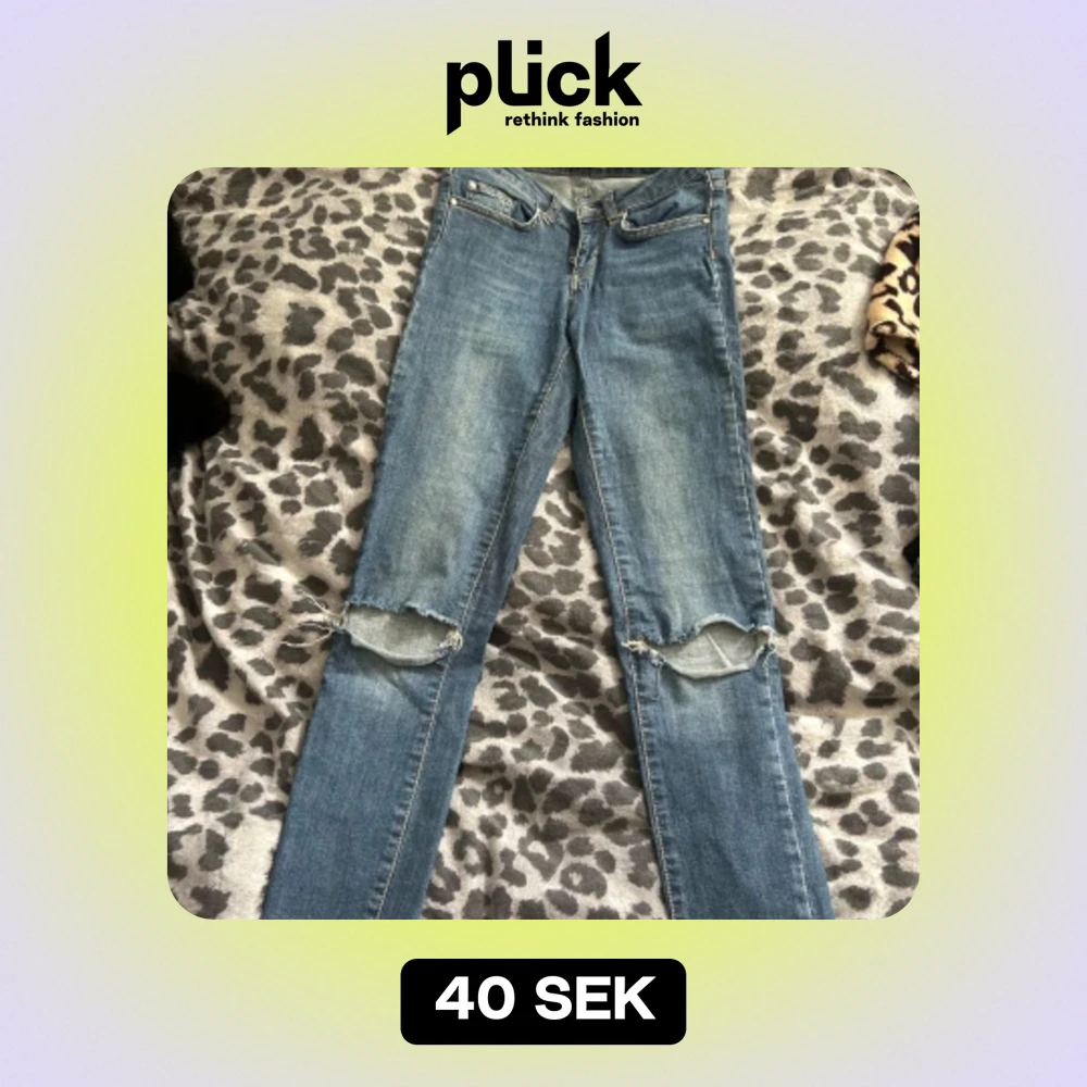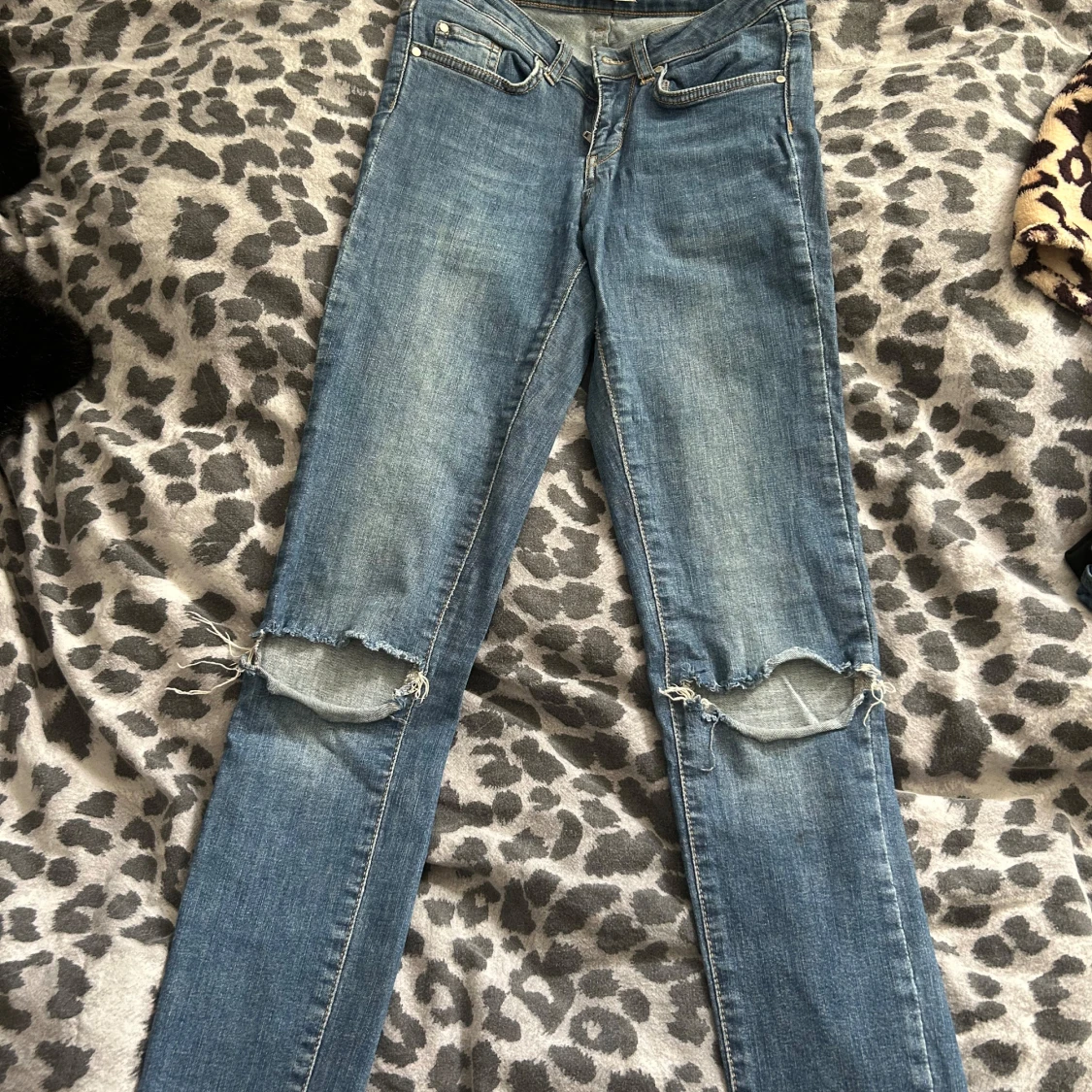 Blåa jeans från gina tricot med hål på knäna, ett hål vid en skärp ögla annars är de i bra skick.