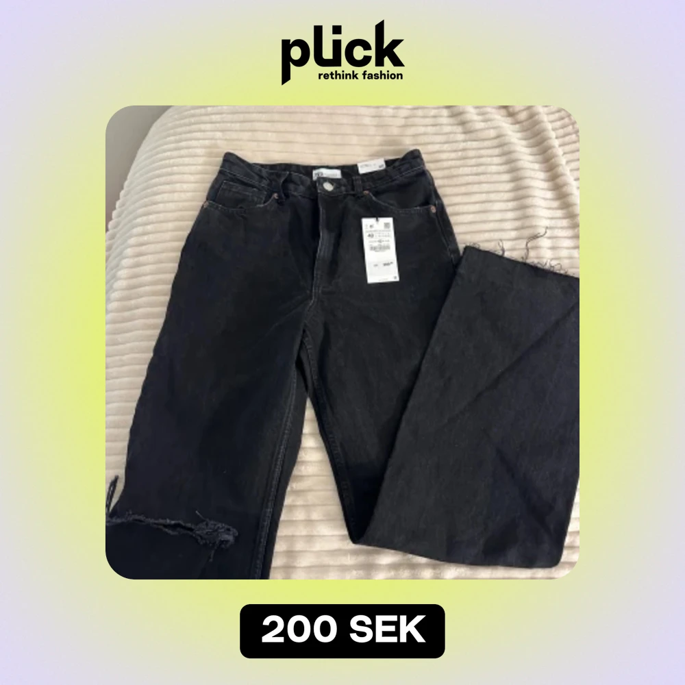 Jeans från Zara med hål i knäna. Aldrig använda därav prislapp kvar. De är långa i benen och har en fin svart washed färg. Storlek 40🖤