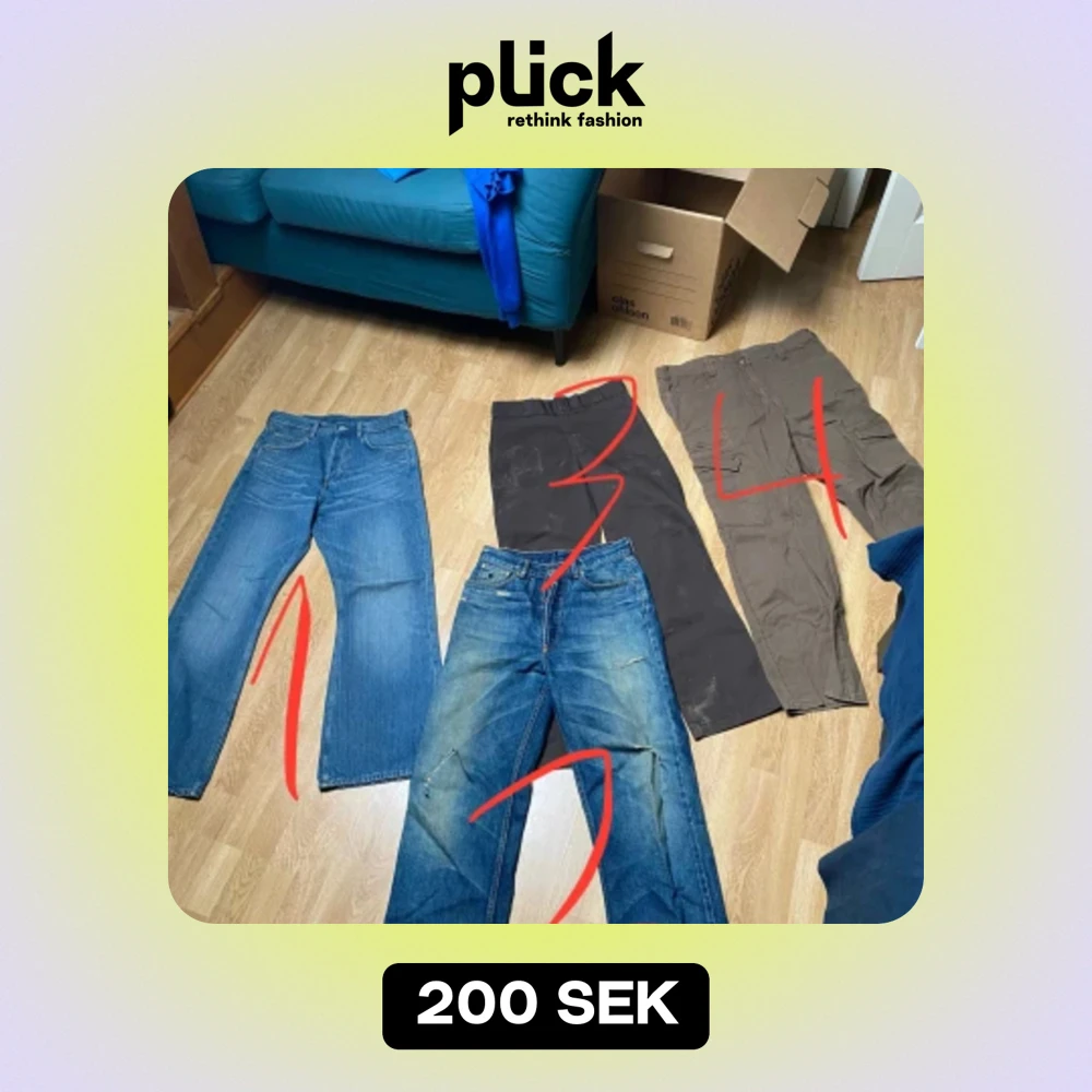 Jeans: 1. Weekday utsvängda jeans 29:32 -150kr 2. Made in USA hemp-jeans 30:32- 200kr 3. Skitiga Dikies 874 31:32- 150kr 4. Okända cargopants 32:32 -150kr 5. Okända höga kostymbyxor 28:30- 100kr 6. Armébyxor 29:30 - 200kr 7. HOPE 28 -450kr