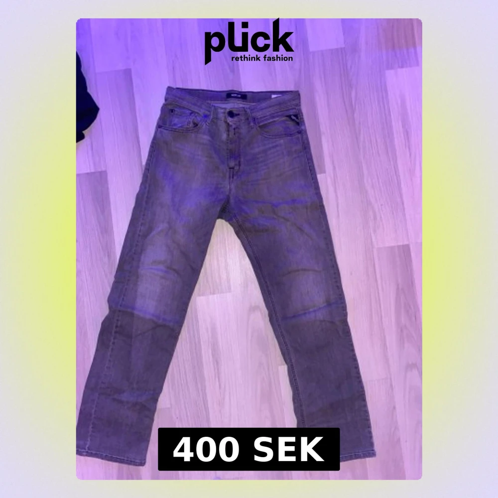 Säljer ett par grå jeans från Replay med klassisk femficksdesign och raka ben. Jeansen har snygga detaljer på bakfickorna och en mörkgrå tvätt som ger en cool vibe. Passar dig som gillar stilrena och tidlösa jeans med lite edge.
