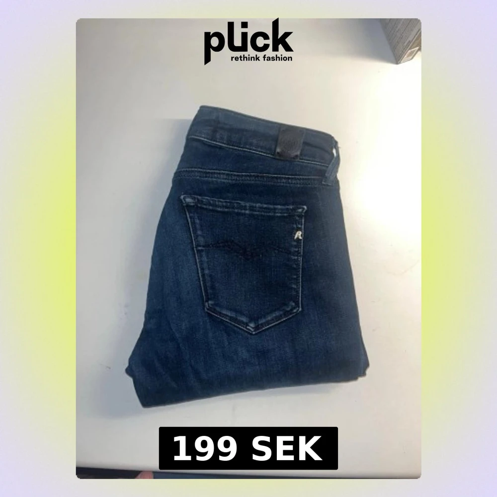Snygga Replay jeans i mörkblå tvätt med smal passform. Jeansen är tillverkade i stretchigt bomullsmaterial för extra komfort. Midja 34cm, längd 92cm. JAG SKICKAR EJ FLER BILDER NÄR JAG BÄR JEANSEN! för storleksguide hänvisar jag till måtten och för bättre inblick i passformen rekommenderar jag att googla på modellnamnet. kolla måtten noggrant :) s5,1