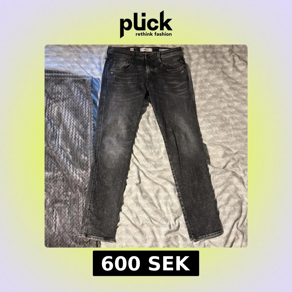 Säljer ett par svarta Replay jeans med slitna detaljer och klassisk femficksdesign. perfekt för dig som gillar en stilren look. Snygga kontrastsömmar och knappgylf. Dem är köpta för 1899kr och är i mycket bra skick. Skriv vid frågor eller vid diskution om pris!