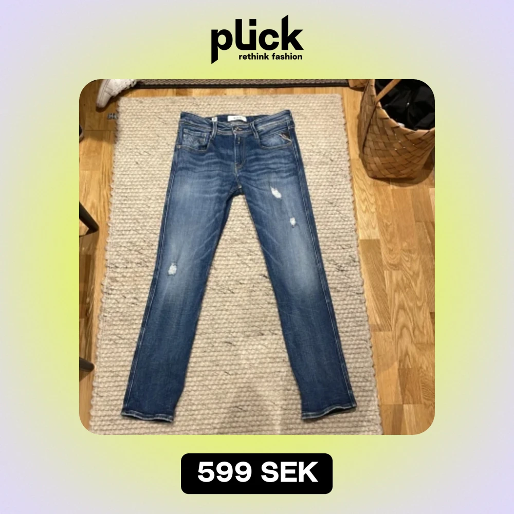 Riktigt snygga och sköna jeans ifrån replay i modellen anbass med snygga slitningar, skick 10/10 nypris 1800