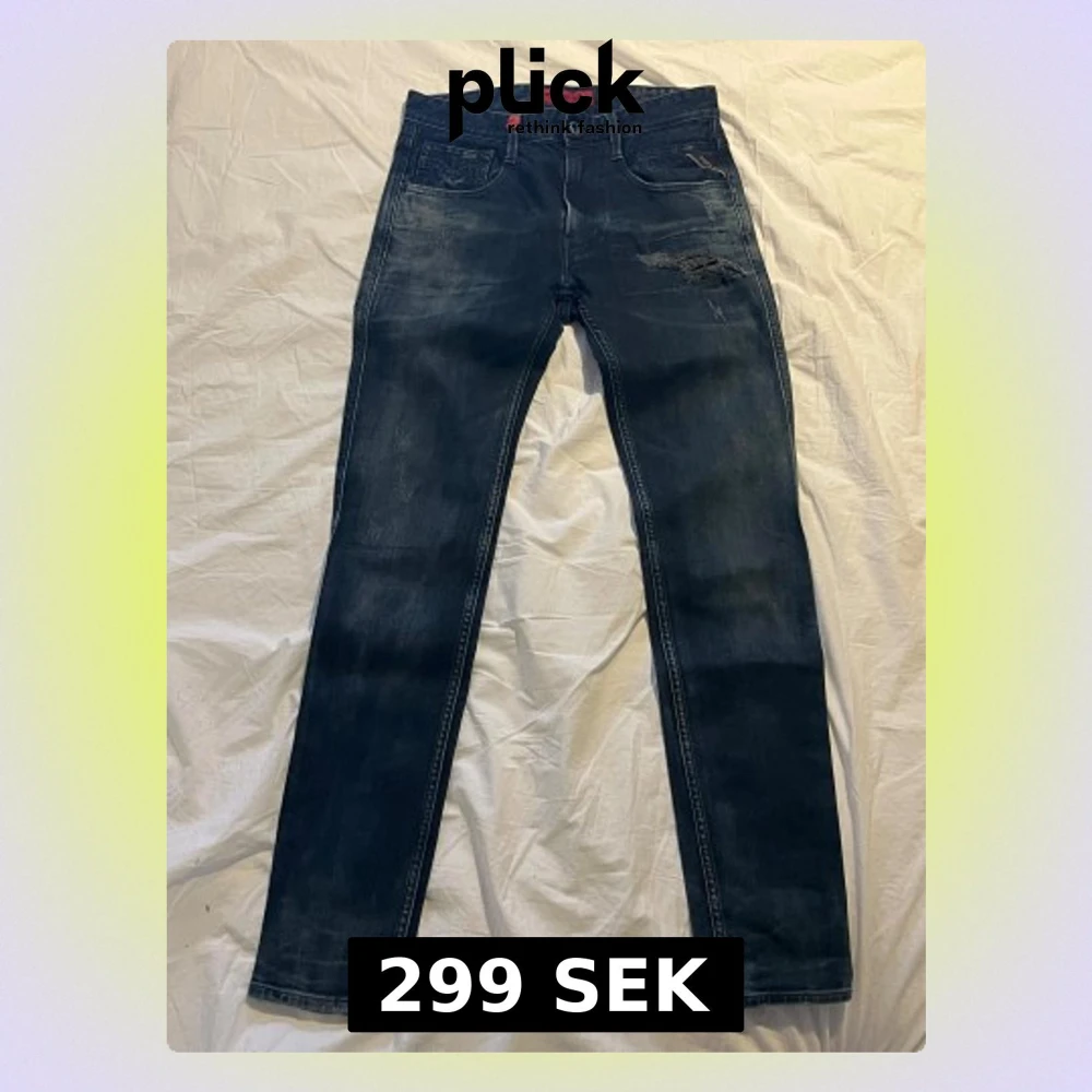 Jag säljer svarta Replay Anbass jeans. Det är en äldre modell men såklart äkta. Dem har inga tecken på användning och absolut inga defekter. När man köper jeansen nya har dem redan slitningarna. Skickar extra fort eftersom det börjar närma sig jul. Storleken är waist 28 och length 32. Skriv vid frågor eller om ni vill ha fler bilder.
