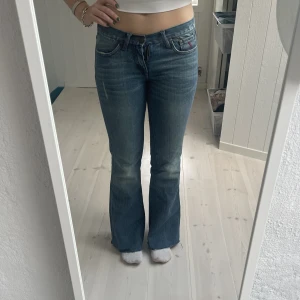 Ett par super fina lågmidjade utsvängda jeans. Jag säljer de eftersom de är för tajta i midjan. Gylfen är dock trasig och de är avklippta. Man kan sätta en säkerhetsnål i gylfen och då ser man inte att den är trasig. Skriv för mått🫶🏻