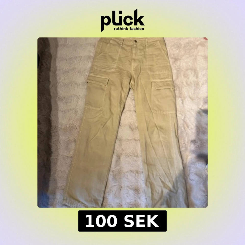 Säljer ett par beige cargobyxor med flera stora fickor på sidorna och bak. Byxorna har rak passform. En knapp på ena sidfickan har lossnat men det är inget som syns eller påverkar användningen