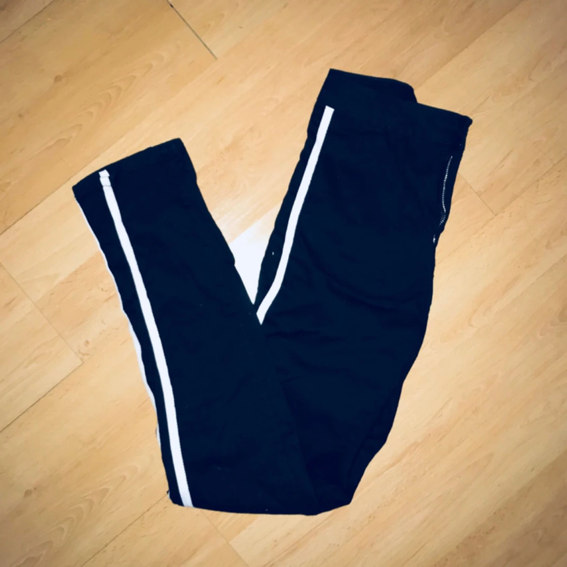 Svarta superstretchiga jeans med vit rand på sidan. Enbart provade för denna bild.