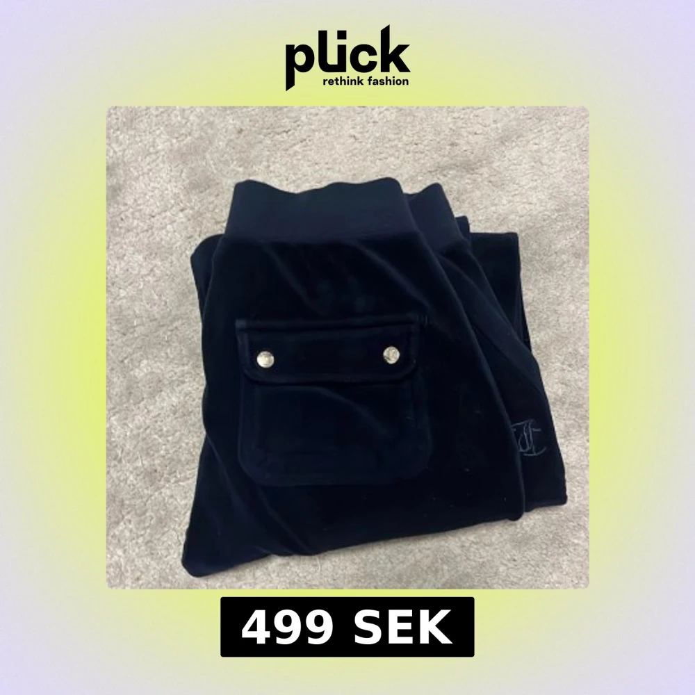 Mörkablåa mjukisbyxor i sammet från Juicy Couture med bred resår och snörning i midjan. Byxorna har fickor fram och bak med lock och guldiga knappar samt broderad JC-logga framtill. Perfekta för en chill och snygg look.