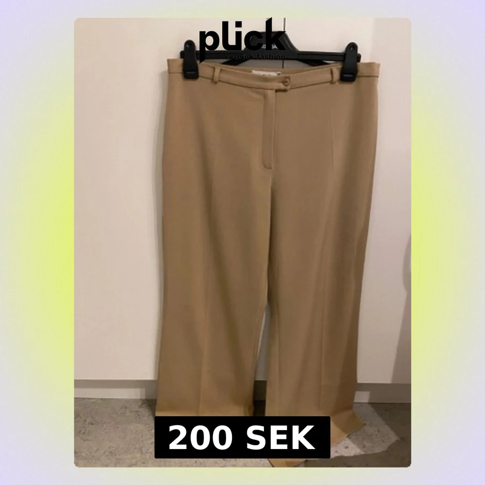 Snygga beiga kostymbyxor från Aleyna Collection i storlek 48. Byxorna har en wide passform med raka ben, hög midja och klassisk knapp- och dragkedjestängning. Materialet är 67% polyester och 33% viskos, vilket ger en mjuk och följsam känsla. Använda en gång innan.