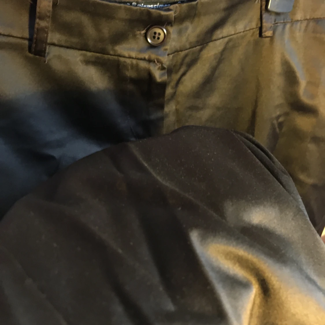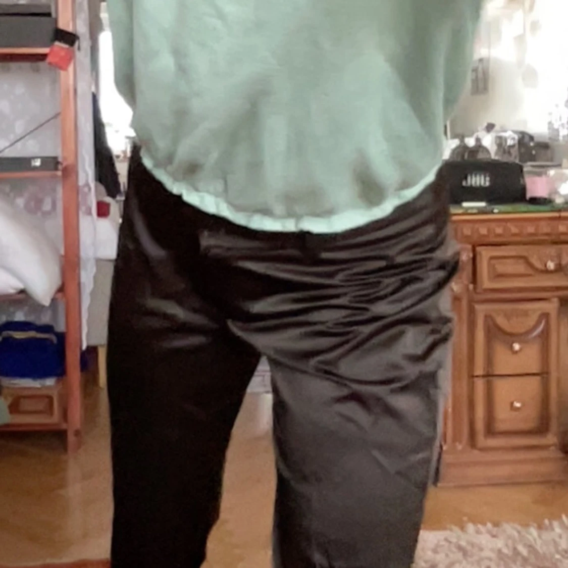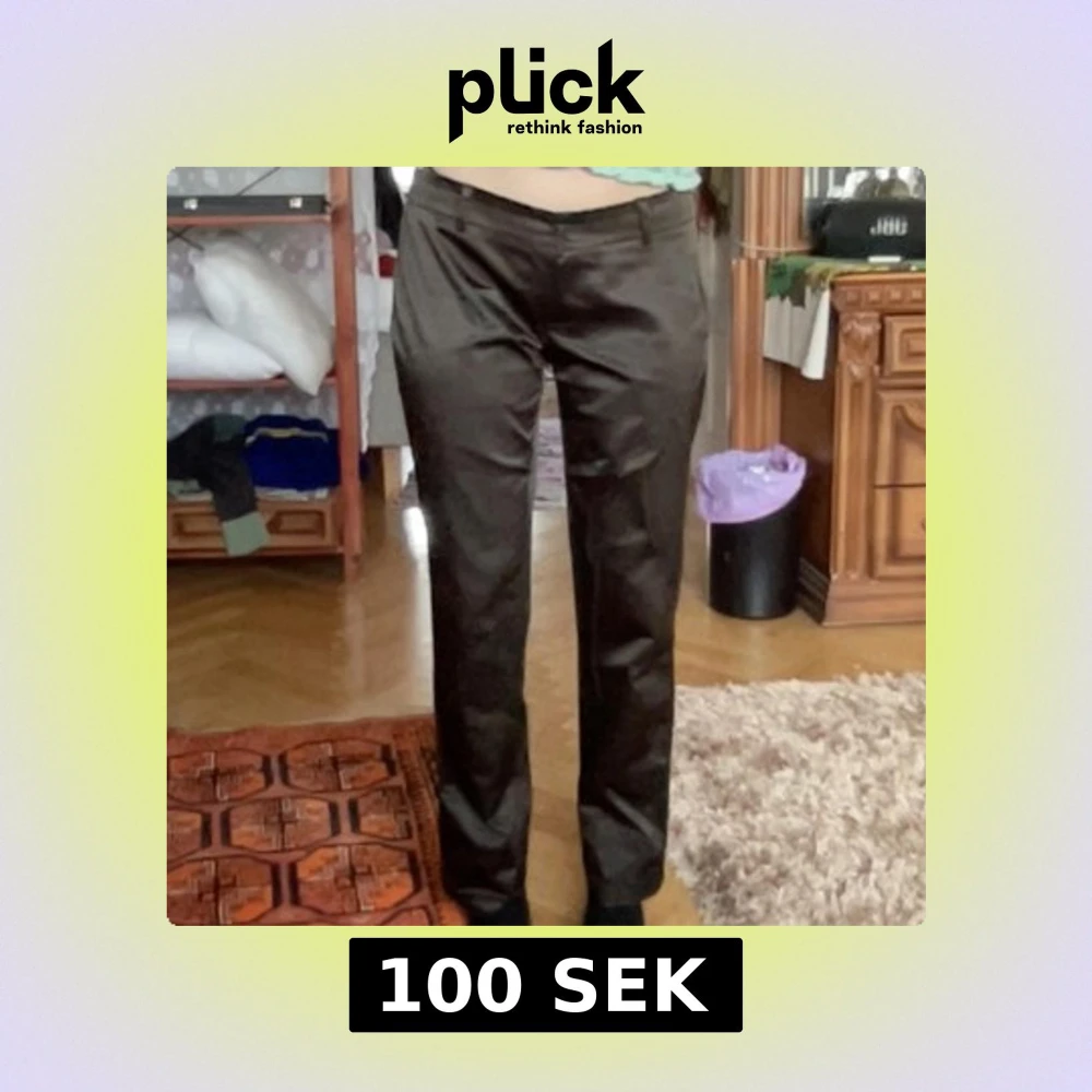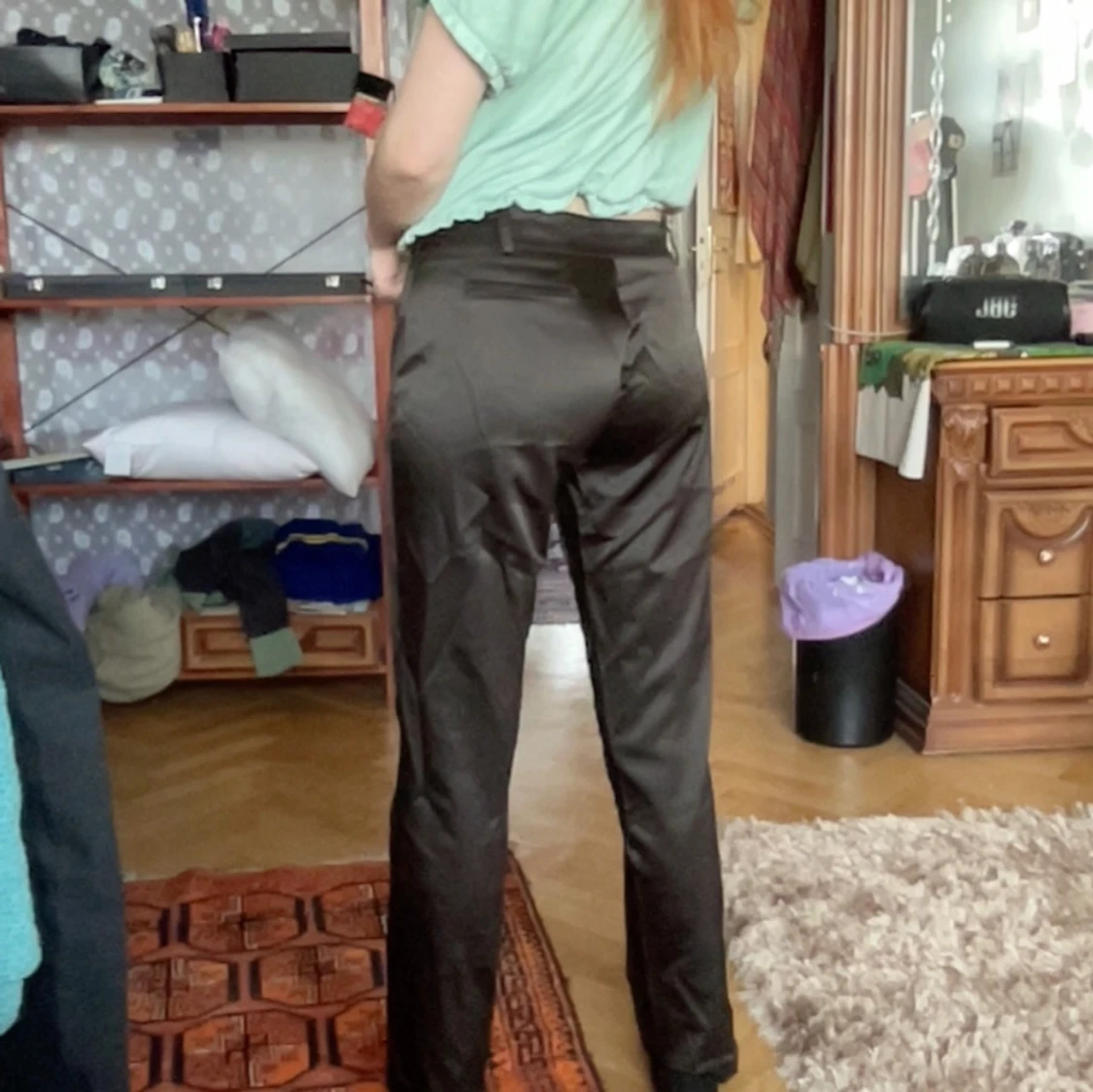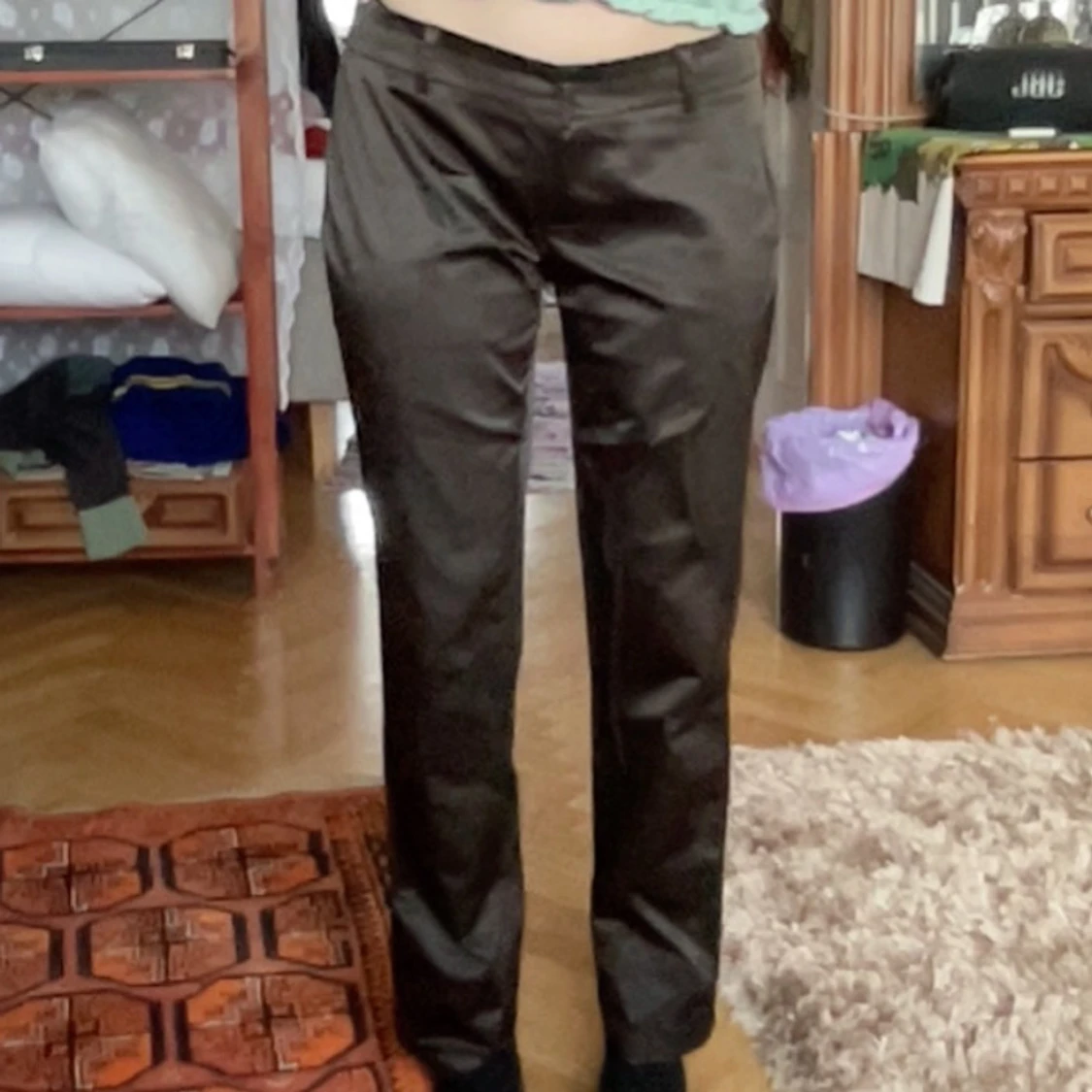 Bruna glansiga byxor med en klassisk rak passform. De har en knapp och dragkedja framtill samt hällor för skärp. Svårt att fånga färgen på bild men de är djupt mörkbruna. Längd: 90cm Bredd: 40cm