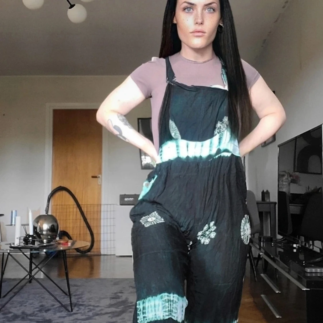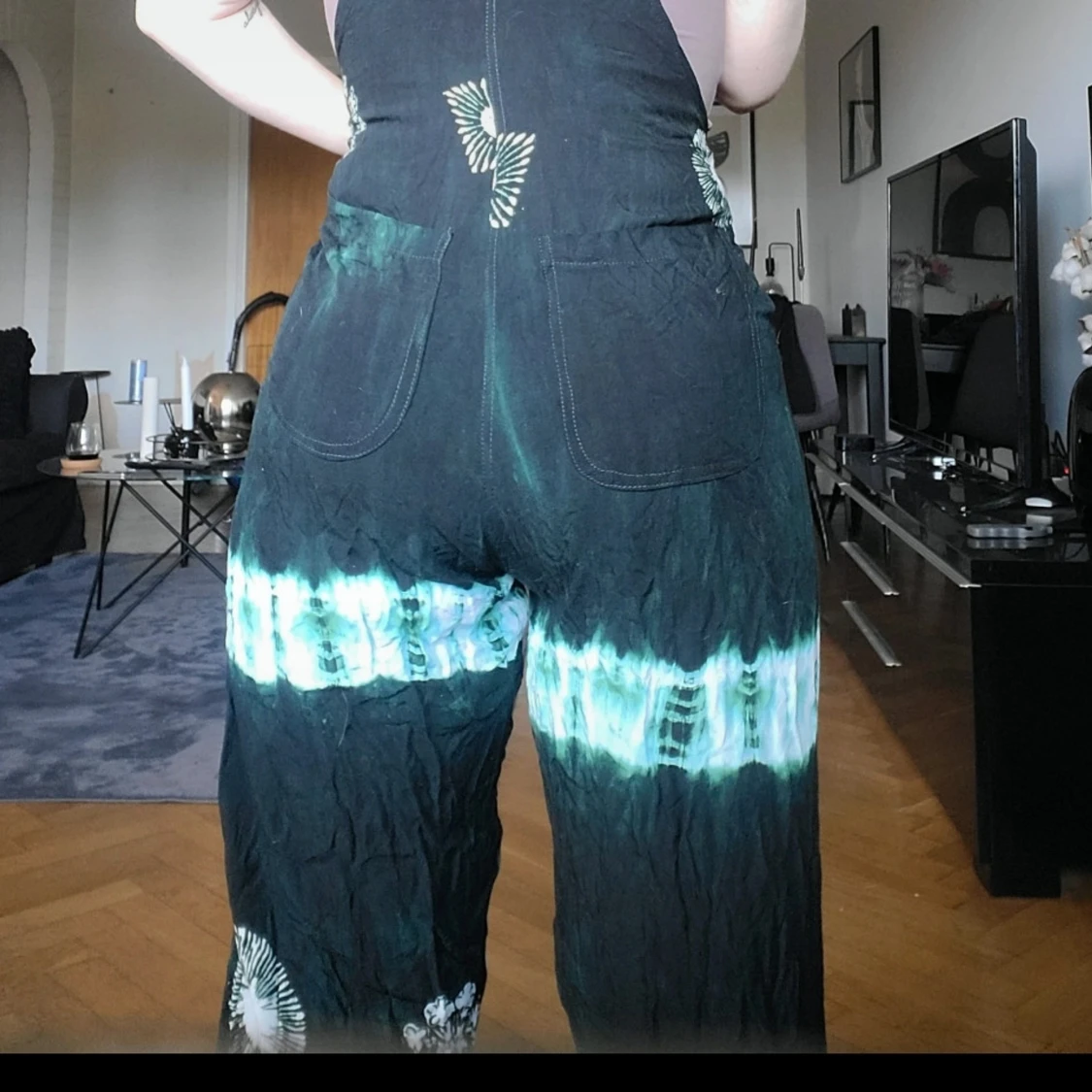 Säljer en loose fit byxdress i svart med turkosa batikmönster och vita detaljer. Byxdressen har breda axelband, raka ben och stora fickor bak. Materialet känns som bomull och plagget har en avslappnad vibe med unika mönster över hela tyget.
