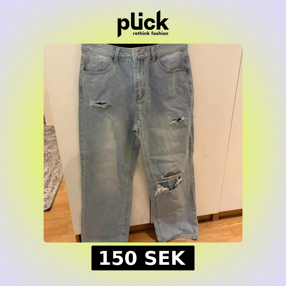 Säljer ett par ljusblå jeans med slitna detaljer och hål på benen och även oanvända. Jeansen är i storlek petite L från Shein men passar på mig som har M.